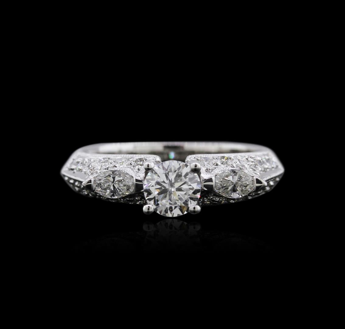 One electronically tested 18KT white gold ladies cast diamond engagement ring with a bright polish finish. Identified with markings of "18K". Condition is new. Containing: One prong set round brilliant cut diamond, measuring 5.20 - 5.20 x 3.25mm (depth est.) approximate weight of 0.54ct. Clarity: SI-2. Color: I, Cut is Good. Two prong set marquise shaped cut diamonds, measuring 4.00 x 2.50 x 1.88mm (depth est.) approximate total weight of 2 Stones = 0.22ct. Clarity: VS-2 to SI-1. Color: I - J, Cut is Good. Thirty-Two prong set round brilliant cut diamonds, measuring 1.50 - 1.20 x 0.81mm (depth est.) approximate total weight of 32 Stones = 0.29ct. Clarity: SI-1. Color: I - J, Cut is Good. All diamonds are graded in the mounting, unless otherwise stated. Total Weight of Diamonds 1.04ct. Total Weight of Engagement Ring 5.60 grams. GGL Appraised at $5,545.00.