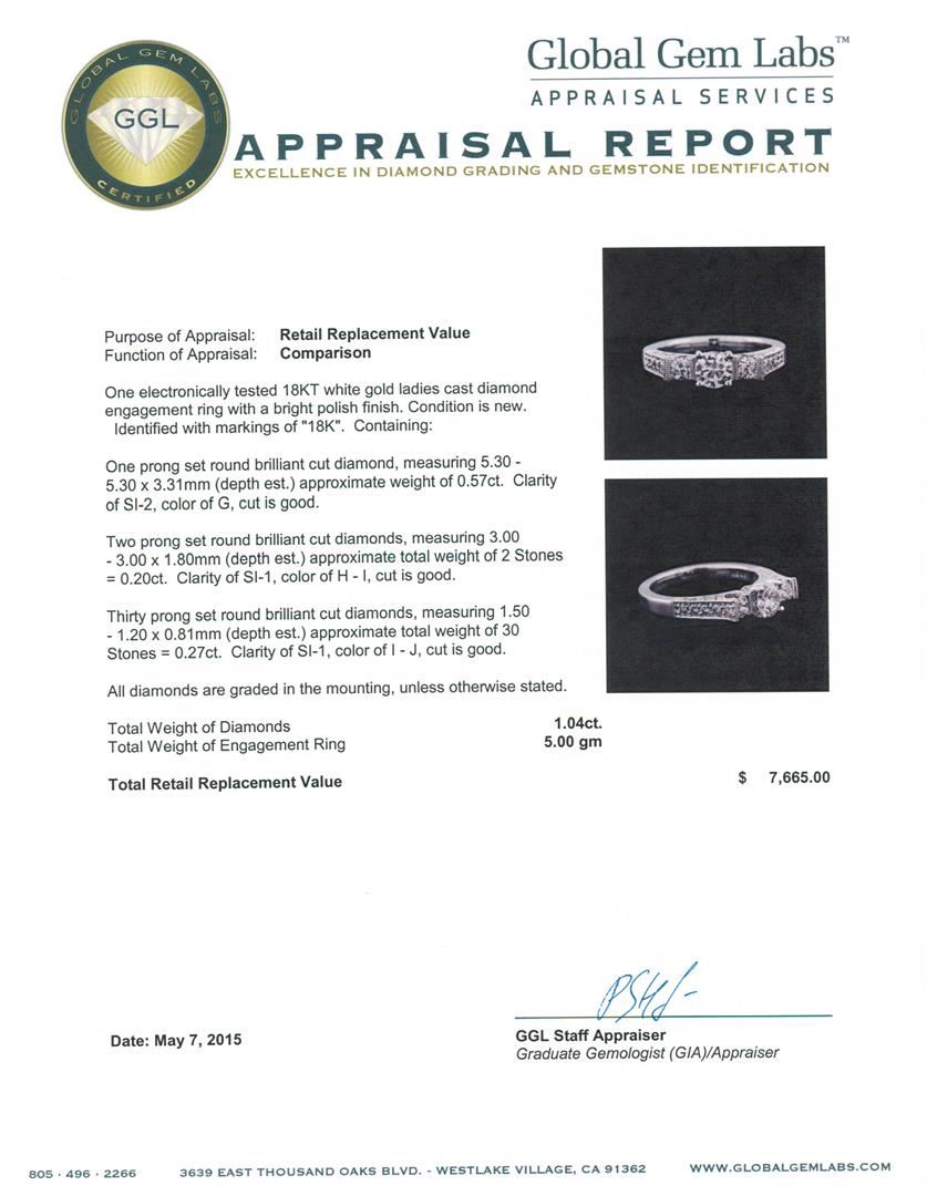 One electronically tested 18KT white gold ladies cast diamond engagement ring with a bright polish finish. Identified with markings of "18K". Condition is new. Containing: One prong set round brilliant cut diamond, measuring 5.30 - 5.30 x 3.31mm (depth est.) approximate weight of 0.57ct. Clarity: SI-2. Color: G, Cut is Good. Two prong set round brilliant cut diamonds, measuring 3.00 - 3.00 x 1.80mm (depth est.) approximate total weight of 2 Stones = 0.20ct. Clarity: SI-1. Color: H - I, Cut is Good. Thirty prong set round brilliant cut diamonds, measuring 1.50 - 1.20 x 0.81mm (depth est.) approximate total weight of 30 Stones = 0.27ct. Clarity: SI-1. Color: I - J, Cut is Good. All diamonds are graded in the mounting, unless otherwise stated. Total Weight of Diamonds 1.04ct. Total Weight of Engagement Ring 5.00 grams. GGL Appraised at $7,665.00.