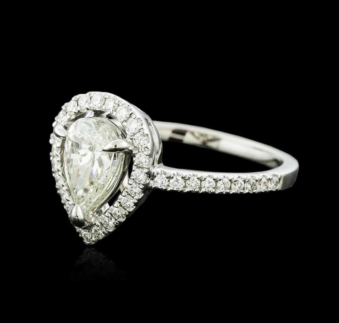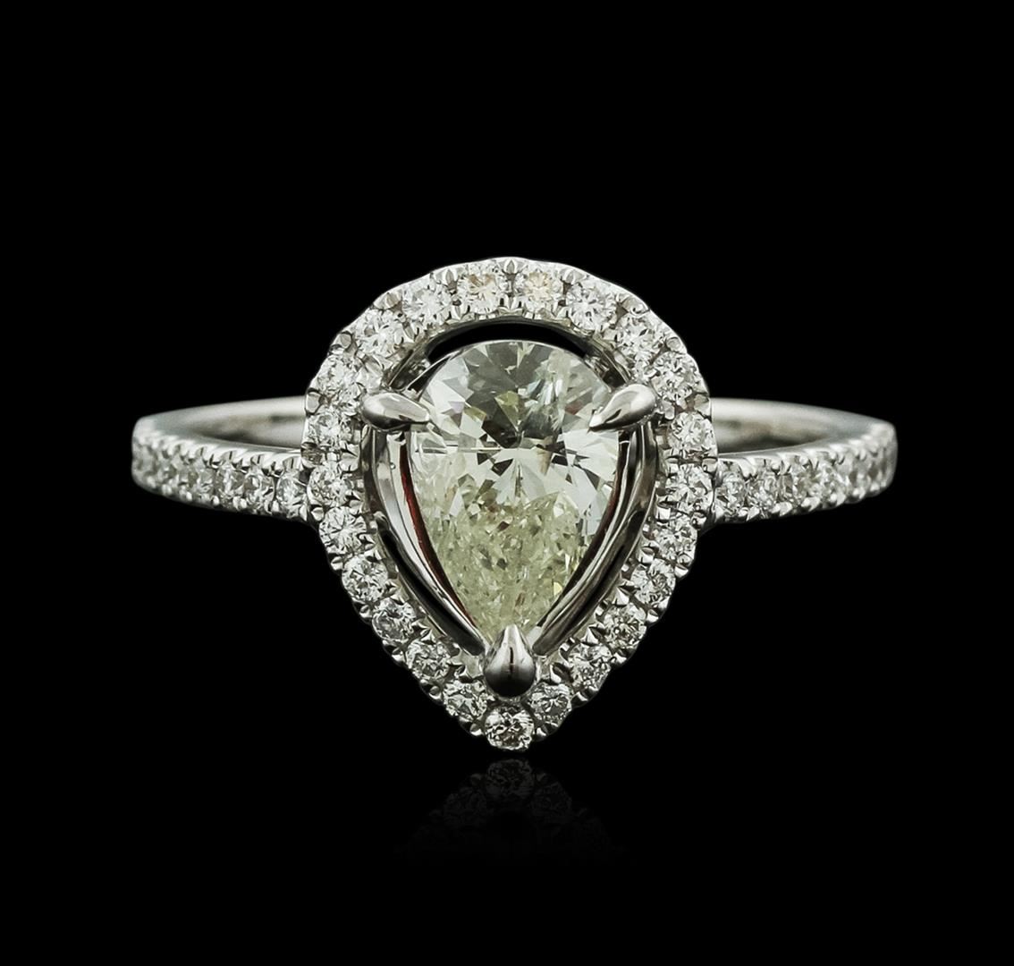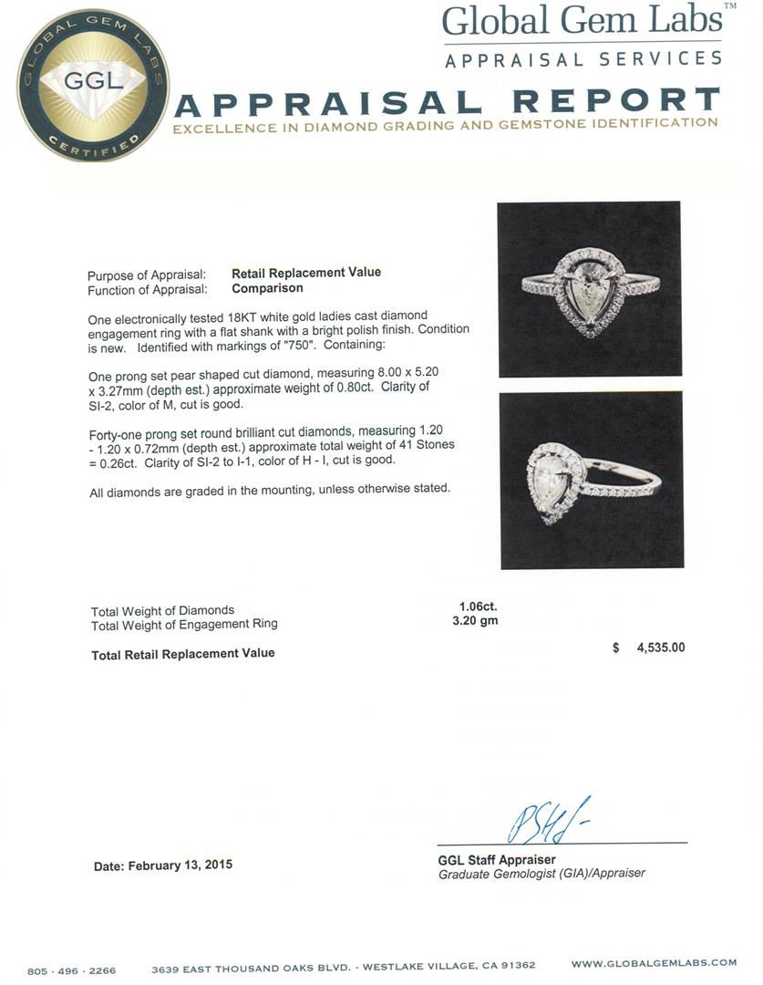 One electronically tested 18KT white gold ladies cast diamond engagement ring with a flat shank with a bright polish finish. Identified with markings of "750". Condition is new. Containing: One prong set pear shaped cut diamond, measuring 8.00 x 5.20 x 3.27mm (depth est.) approximate weight of 0.80ct. Clarity: SI-2. Color: M, Cut is Good. Forty-One prong set round brilliant cut diamonds, measuring 1.20 - 1.20 x 0.72mm (depth est.) approximate total weight of 41 Stones = 0.26ct. Clarity: SI-2 to I-1. Color: H - I, Cut is Good. All diamonds are graded in the mounting, unless otherwise stated. Total Weight of Diamonds 1.06ct. Total Weight of Engagement Ring 3.20 grams. GGL Appraised at $4,535.00.