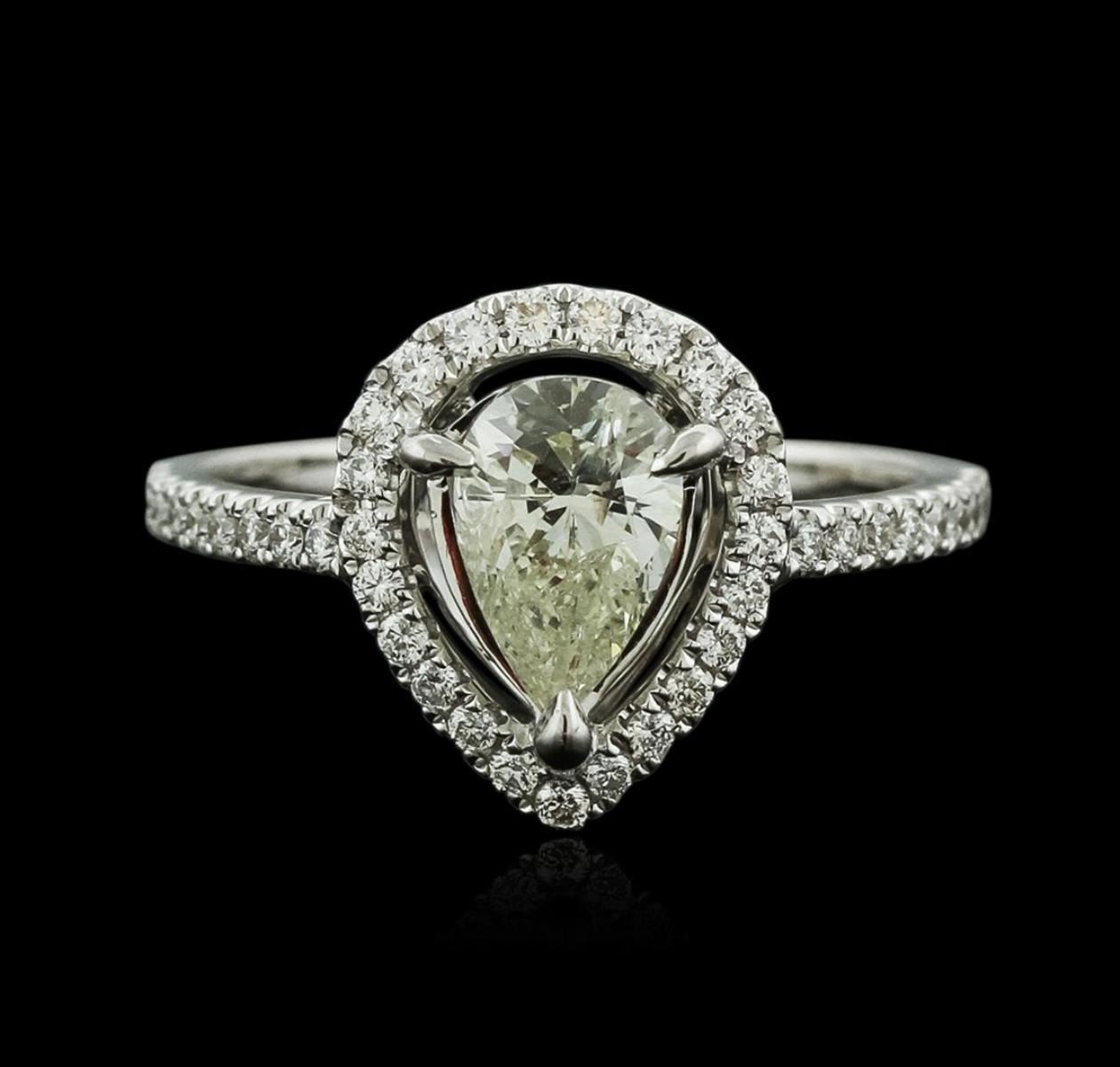 One electronically tested 18KT white gold ladies cast diamond engagement ring with a flat shank with a bright polish finish. Identified with markings of "750". Condition is new. Containing: One prong set pear shaped cut diamond, measuring 8.00 x 5.20 x 3.27mm (depth est.) approximate weight of 0.80ct. Clarity: SI-2. Color: M, Cut is Good. Forty-One prong set round brilliant cut diamonds, measuring 1.20 - 1.20 x 0.72mm (depth est.) approximate total weight of 41 Stones = 0.26ct. Clarity: SI-2 to I-1. Color: H - I, Cut is Good. All diamonds are graded in the mounting, unless otherwise stated. Total Weight of Diamonds 1.06ct. Total Weight of Engagement Ring 3.20 grams. GGL Appraised.