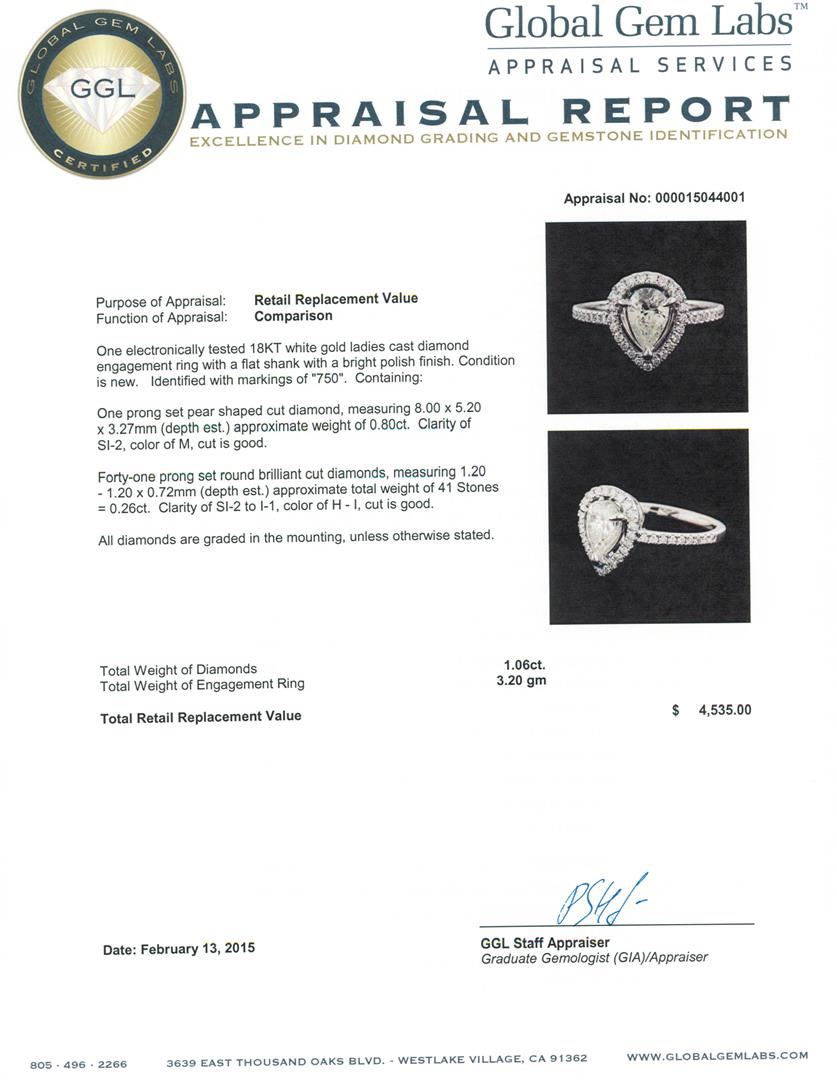 One electronically tested 18KT white gold ladies cast diamond engagement ring with a flat shank with a bright polish finish. Identified with markings of "750". Condition is new. Containing: One prong set pear shaped cut diamond, measuring 8.00 x 5.20 x 3.27mm (depth est.) approximate weight of 0.80ct. Clarity: SI-2. Color: M, Cut is Good. Forty-One prong set round brilliant cut diamonds, measuring 1.20 - 1.20 x 0.72mm (depth est.) approximate total weight of 41 Stones = 0.26ct. Clarity: SI-2 to I-1. Color: H - I, Cut is Good. All diamonds are graded in the mounting, unless otherwise stated. Total Weight of Diamonds 1.06ct. Total Weight of Engagement Ring 3.20 grams. GGL Appraised at $4,535.00.