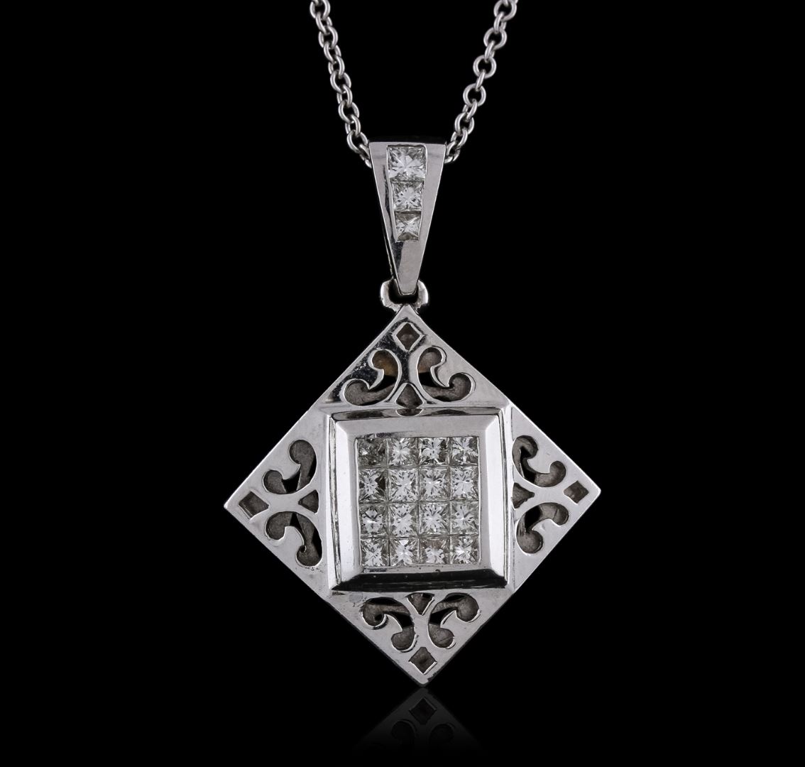 One electronically tested 18KT white gold ladies cast & assembled diamond pendant with chain. The pendant features an organized diamond cluster set within an open lattice design, completed by a diamond set bail. The pendant is supported by a sixteen inch length 14KT white gold designer style chain, terminating in a lobster claw clasp. Bright polish finish. Identified with markings of "18K". Condition is new, good workmanship. Containing: Nineteen invisible and channel set princess cut diamonds, measuring 2.10 x 2.00 x 1.50mm (depth est.) approximate total weight of 19 Stones = 1.08ct. Graded in the setting. Clarity: VS-1 to SI-1. Color: H - J. Total Weight of Diamonds 1.08ct. Total Weight of Pendant With Chain 13.91 grams. AIG Appraised at $5,945.00.