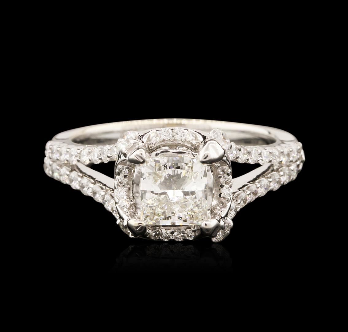 One electronically tested 18KT white gold ladies combination cast & assembled diamond engagement ring with a flat shank with a bright polish finish. Identified with markings of "750". Condition is new. Containing: One prong set princess cut diamond, measuring 5.05 x 5.04 x 3.78mm (depth est.) approximate weight of 0.79ct. Clarity: SI-1. Color: L, Cut is Good. Forty-Eight prong set round brilliant cut diamonds, measuring 1.20 - 1.20 x 0.72mm (depth est.) approximate total weight of 48 Stones = 0.30ct. Clarity: SI-2 to I-1. Color: I - J, Cut is Good. All diamonds are graded in the mounting, unless otherwise stated. Total Weight of Diamonds 1.09ct. Total Weight of Engagement Ring 3.90 grams. GGL Appraised at $5,850.00.