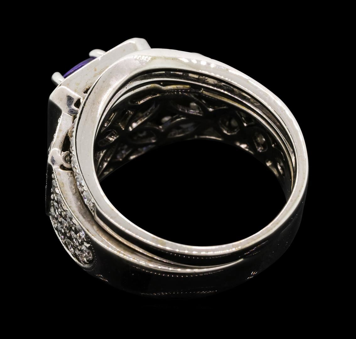 One electronically tested 18KT white gold lady's combination cast & assembled fashion ring and attached band with a cathedral shank with a bright polish with milgrain detailing finish. The featured lady's ring has a double shank measuring 6.10 millimeters wide. Trademark is Parade. Identified with markings of "18K". Condition is used, good workmanship. Containing: One prong set rectangular cushion modified brilliant cut natural tanzanite, measuring 7.05 x 5.01 x 3.40mm, (depth est.) 10%. bulge factor, approximate weight of 1.09ct., clarity is slightly included, medium, very slightly grayish, violetish blue color, (GIA vB 5/3), cut is good. Transmitting light with a minimum of distortion, transparent. Colored gemstones are presumed to have been subjected to commonly used enhancement processes. Graded in the setting. Two bezel set baguette cut diamonds, measuring from 3.00 x 2.10 x 1.79mm (depth est.) to 3.10 x 2.20 x 1.88mm (depth est.) approximate. Total Weight of 2 Stones = 0.22ct. Graded in the setting. Color HClarity VS-2 Cut Very Good Seventy-Two prong set round brilliant cut diamonds, measuring 1.80 - 1.65 x 1.07mm (depth est.) approximate. Total Weight of 72 Stones = 1.40ct. Graded in the setting. Color H - I Clarity SI-1 to SI-2 Cut Good. Total Weight of Colored Stones 1.09ct.. Total Weight of Diamonds 1.62ct.. Total Weight of Ring And Attached Band 11.00gm. GAS Appraised.