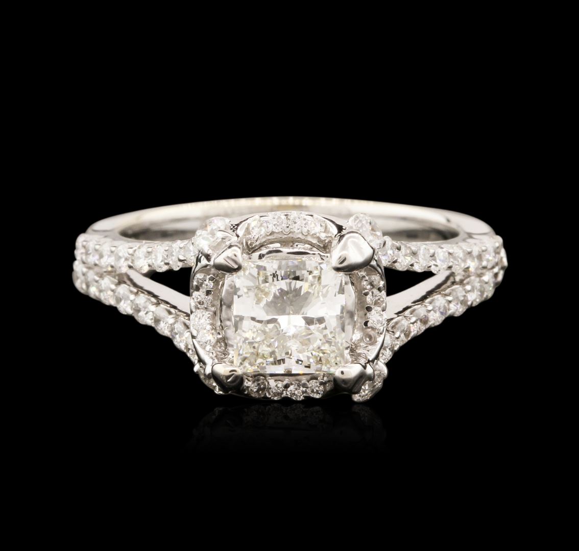One electronically tested 18KT white gold ladies combination cast & assembled diamond engagement ring with a flat shank with a bright polish finish. Identified with markings of "750". Condition is new. Containing: One prong set princess cut diamond, measuring 5.05 x 5.04 x 3.78mm (depth est.) approximate weight of 0.79ct. Clarity: SI-1. Color: L, Cut is Good. Forty-Eight prong set round brilliant cut diamonds, measuring 1.20 - 1.20 x 0.72mm (depth est.) approximate total weight of 48 Stones = 0.30ct. Clarity: SI-2 to I-1. Color: I - J, Cut is Good. All diamonds are graded in the mounting, unless otherwise stated. Total Weight of Diamonds 1.09ct. Total Weight of Engagement Ring 3.90 grams. GGL Appraised at $5,850.00.