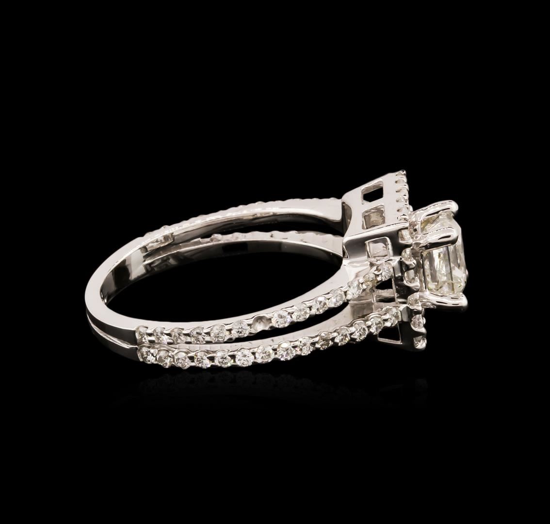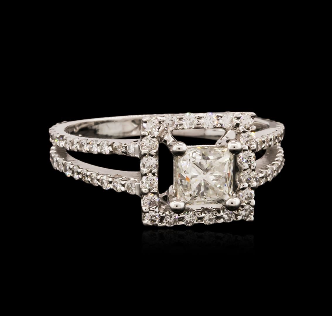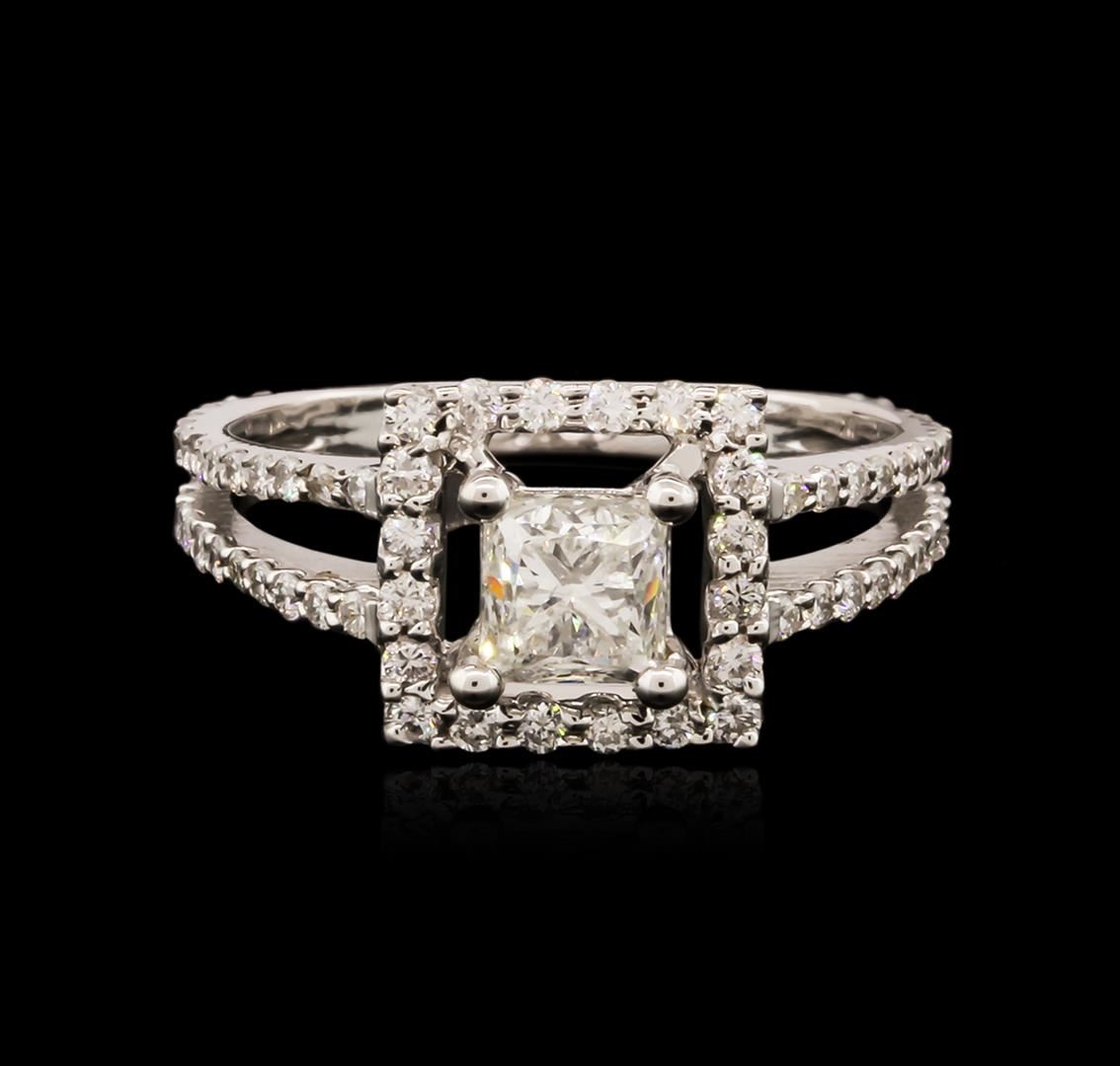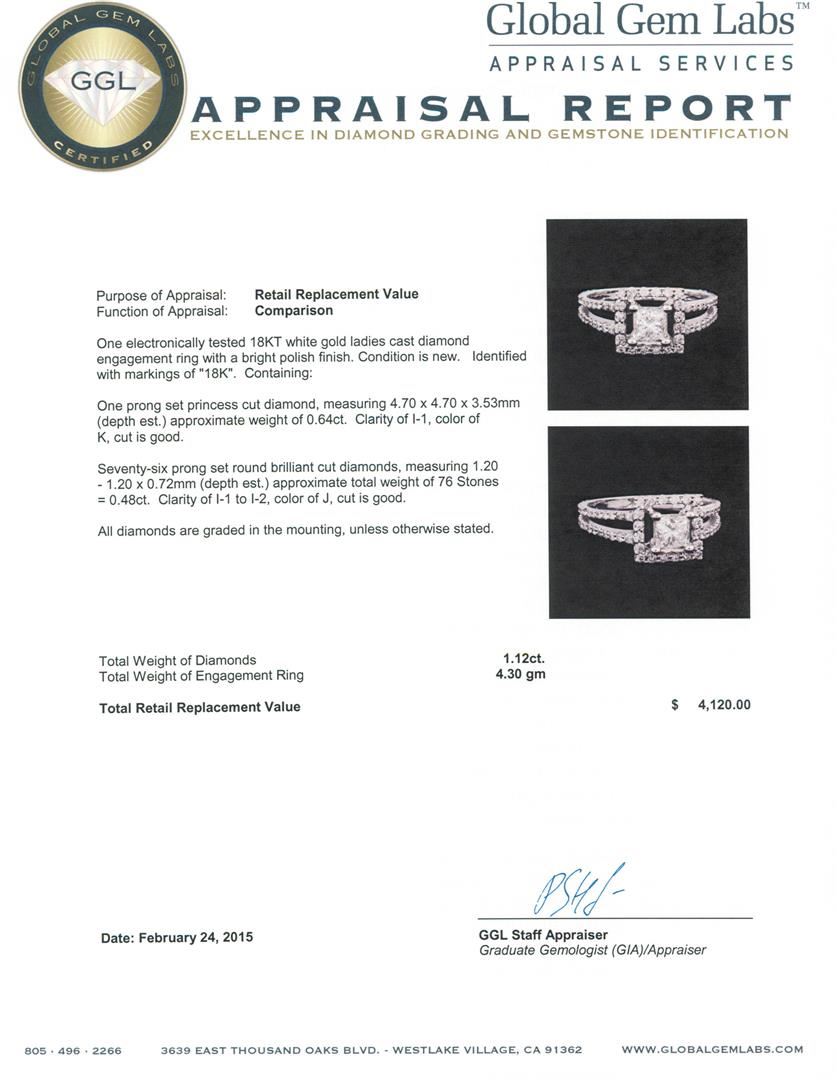 One electronically tested 18KT white gold ladies cast diamond engagement ring with a bright polish finish. Identified with markings of "18K". Condition is new. Containing: One prong set princess cut diamond, measuring 4.70 x 4.70 x 3.53mm (depth est.) approximate weight of 0.64ct. Clarity: I-1. Color: K, Cut is Good. Seventy-Six prong set round brilliant cut diamonds, measuring 1.20 - 1.20 x 0.72mm (depth est.) approximate total weight of 76 Stones = 0.48ct. Clarity: I-1 to I-2. Color: J, Cut is Good. All diamonds are graded in the mounting, unless otherwise stated. Total Weight of Diamonds 1.12ct. Total Weight of Engagement Ring 4.30 grams. GGL Appraised at $4,120.00.