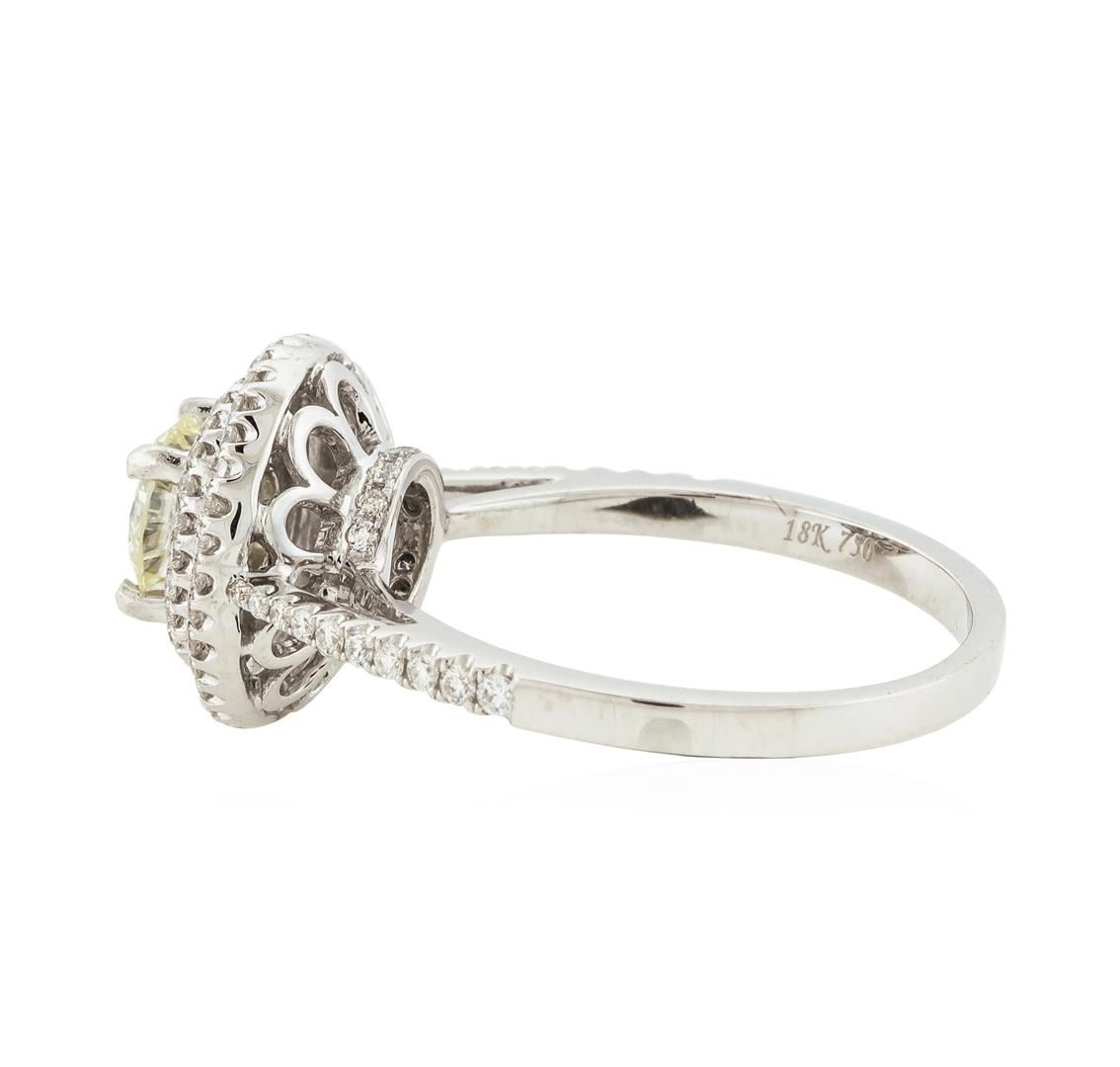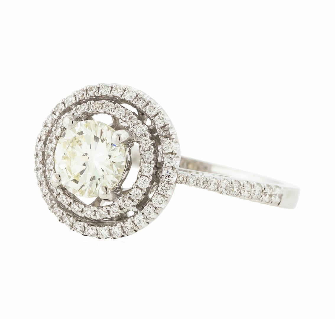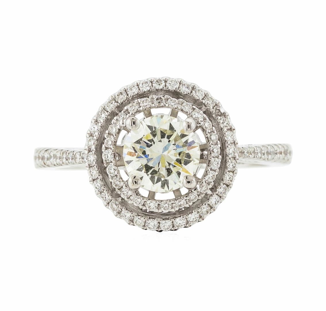 One electronically tested 18KT white gold lady's cast fashion ring with a cathedral double basket halo with a bright polish finish. The featured lady's ring has a shank measuring 1.74 millimeters wide. Identified with markings of "18K 750". Condition is new, good workmanship. Containing: One prong set round brilliant cut diamond, measuring 5.81 - 5.80 x 3.39mm (depth est.) approximate weight of 0.77ct. Graded in the setting. Clarity: SI-2. Color: JCut Good Twelve prong set round brilliant cut diamonds, measuring 1.30 - 1.20 x 0.78mm (depth est.) approximate total weight of 12 Stones = 0.09ct. Graded in the setting. Clarity: VS-2 to SI-1. Color: G - HCut Very Good Seventy-Eight prong set round brilliant cut diamonds, measuring 1.00 - 0.90 x 0.59mm (depth est.) approximate total weight of 78 Stones = 0.26ct. Graded in the setting. Clarity: SI-1 to SI-2. Color: G - HCut Good. Total Weight of Diamonds 1.12ct. Total Weight of Ring 4.40gm. GAS Appraised.