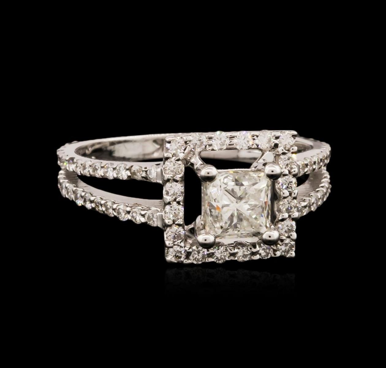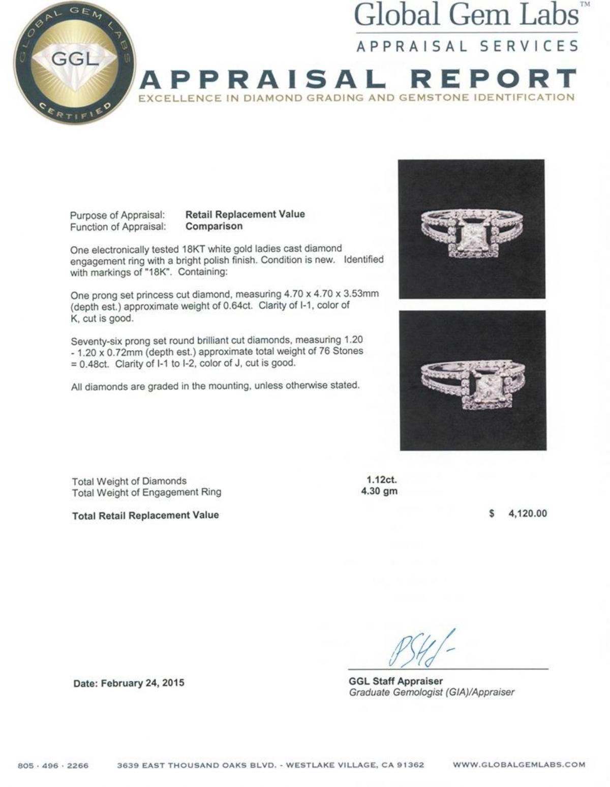One electronically tested 18KT white gold ladies cast diamond engagement ring with a bright polish finish. Identified with markings of "18K". Condition is new. Containing: One prong set princess cut diamond, measuring 4.70 x 4.70 x 3.53mm (depth est.) approximate weight of 0.64ct. Clarity: I-1. Color: K, Cut is Good. Seventy-Six prong set round brilliant cut diamonds, measuring 1.20 - 1.20 x 0.72mm (depth est.) approximate total weight of 76 Stones = 0.48ct. Clarity: I-1 to I-2. Color: J, Cut is Good. All diamonds are graded in the mounting, unless otherwise stated. Total Weight of Diamonds 1.12ct. Total Weight of Engagement Ring 4.30 grams. GGL Appraised.