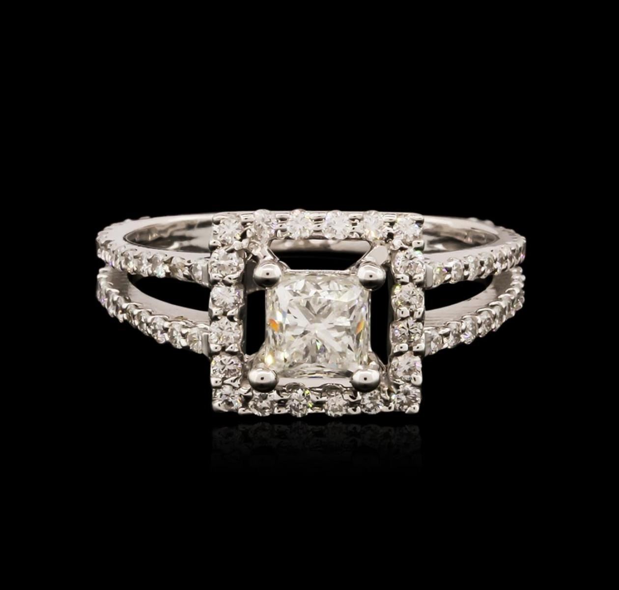 One electronically tested 18KT white gold ladies cast diamond engagement ring with a bright polish finish. Identified with markings of "18K". Condition is new. Containing: One prong set princess cut diamond, measuring 4.70 x 4.70 x 3.53mm (depth est.) approximate weight of 0.64ct. Clarity: I-1. Color: K, Cut is Good. Seventy-Six prong set round brilliant cut diamonds, measuring 1.20 - 1.20 x 0.72mm (depth est.) approximate total weight of 76 Stones = 0.48ct. Clarity: I-1 to I-2. Color: J, Cut is Good. All diamonds are graded in the mounting, unless otherwise stated. Total Weight of Diamonds 1.12ct. Total Weight of Engagement Ring 4.30 grams. GGL Appraised.