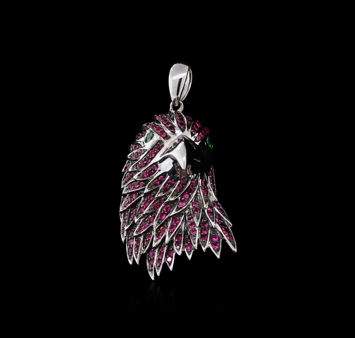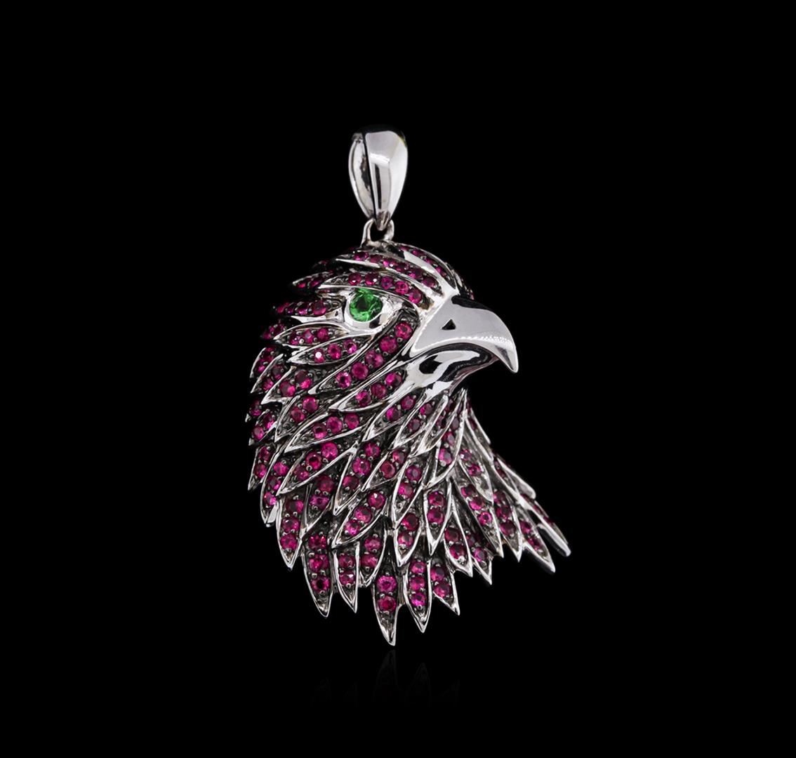 One eagle pendant featuring: 18KT white gold weighing 7.52 grams containing 146 hot pink rubies with a total weight of 1.12ct and 2 tsavorites with a total weight of 0.11ct.