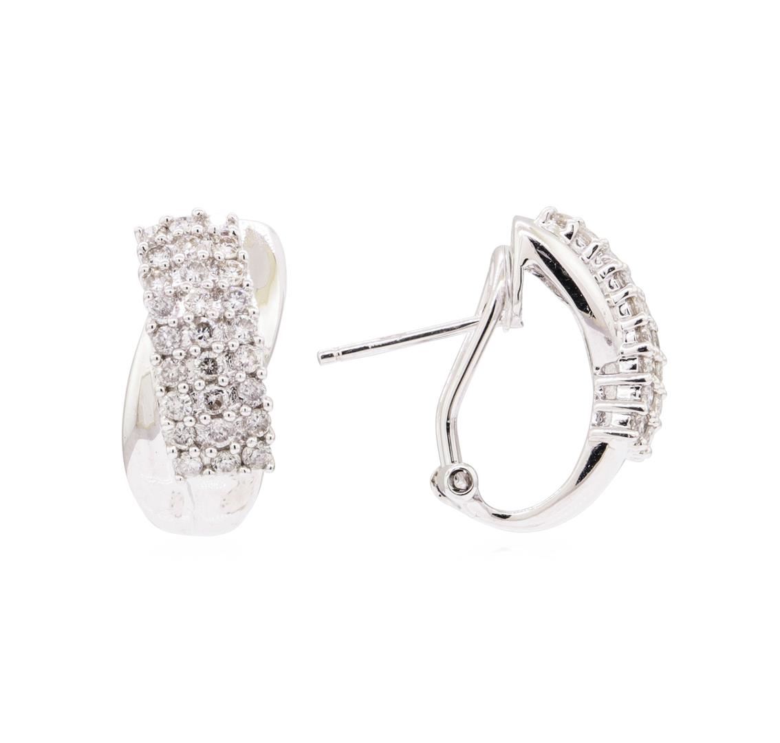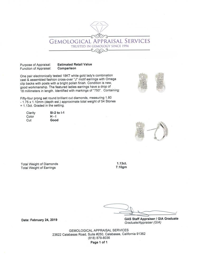 One pair electronically tested 18KT white gold lady's combination cast & assembled fashion cross-over 'J' motif earrings with Omega clip backs with posts with a bright polish finish. The featured ladies earrings have a drop of 18 millimeters in length. Identified with markings of '750'. Condition is new, good workmanship. Containing: Fifty-Four prong set round brilliant cut diamonds, measuring 1.80 - 1.75 x 1.10mm (depth est.) approximate total weight of 54 Stones = 1.13ct. Graded in the setting. Color H - I, Clarity SI-2 to I-1, Cut Good. Total Weight of Diamonds 1.13ct. Total Weight of Earrings 7.10gm. GAS Appraised.