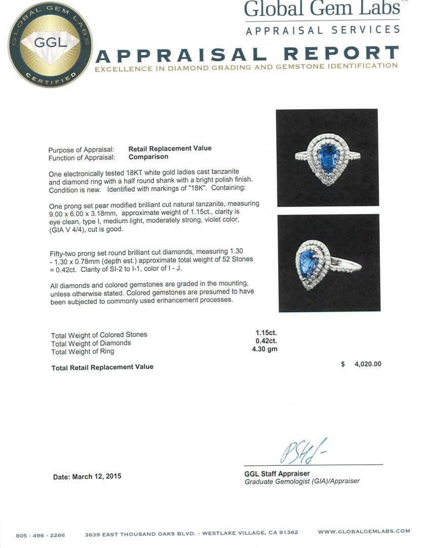 One electronically tested 18KT white gold ladies cast tanzanite and diamond ring with a half round shank with a bright polish finish. Identified with markings of "18K". Condition is new. Containing: One prong set pear modified brilliant cut natural tanzanite, measuring 9.00 x 6.00 x 3.18mm, approximate weight of 1.15ct., clarity is eye clean, type I, medium light, moderately strong, violet color, (GIA V 4/4), cut is good. Fifty-Two prong set round brilliant cut diamonds, measuring 1.30 - 1.30 x 0.78mm (depth est.) approximate total weight of 52 Stones = 0.42ct. Clarity: SI-2 to I-1. Color: I - J. All diamonds and colored gemstones are graded in the mounting, unless otherwise stated. Colored gemstones are presumed to have been subjected to commonly used enhancement processes. Total Weight of Colored Stones 1.15ct. Total Weight of Diamonds 0.42ct. Total Weight of Ring 4.30 grams. GGL Appraised.