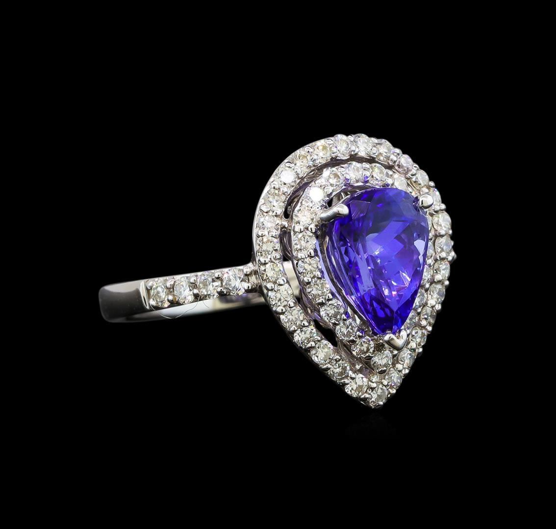 One electronically tested 18KT white gold ladies cast tanzanite and diamond ring with a half round shank with a bright polish finish. Identified with markings of "18K". Condition is new. Containing: One prong set pear modified brilliant cut natural tanzanite, measuring 9.00 x 6.00 x 3.18mm, approximate weight of 1.15ct., clarity is eye clean, type I, medium light, moderately strong, violet color, (GIA V 4/4), cut is good. Fifty-Two prong set round brilliant cut diamonds, measuring 1.30 - 1.30 x 0.78mm (depth est.) approximate total weight of 52 Stones = 0.42ct. Clarity: SI-2 to I-1. Color: I - J. All diamonds and colored gemstones are graded in the mounting, unless otherwise stated. Colored gemstones are presumed to have been subjected to commonly used enhancement processes. Total Weight of Colored Stones 1.15ct. Total Weight of Diamonds 0.42ct. Total Weight of Ring 4.30 grams. GGL Appraised.