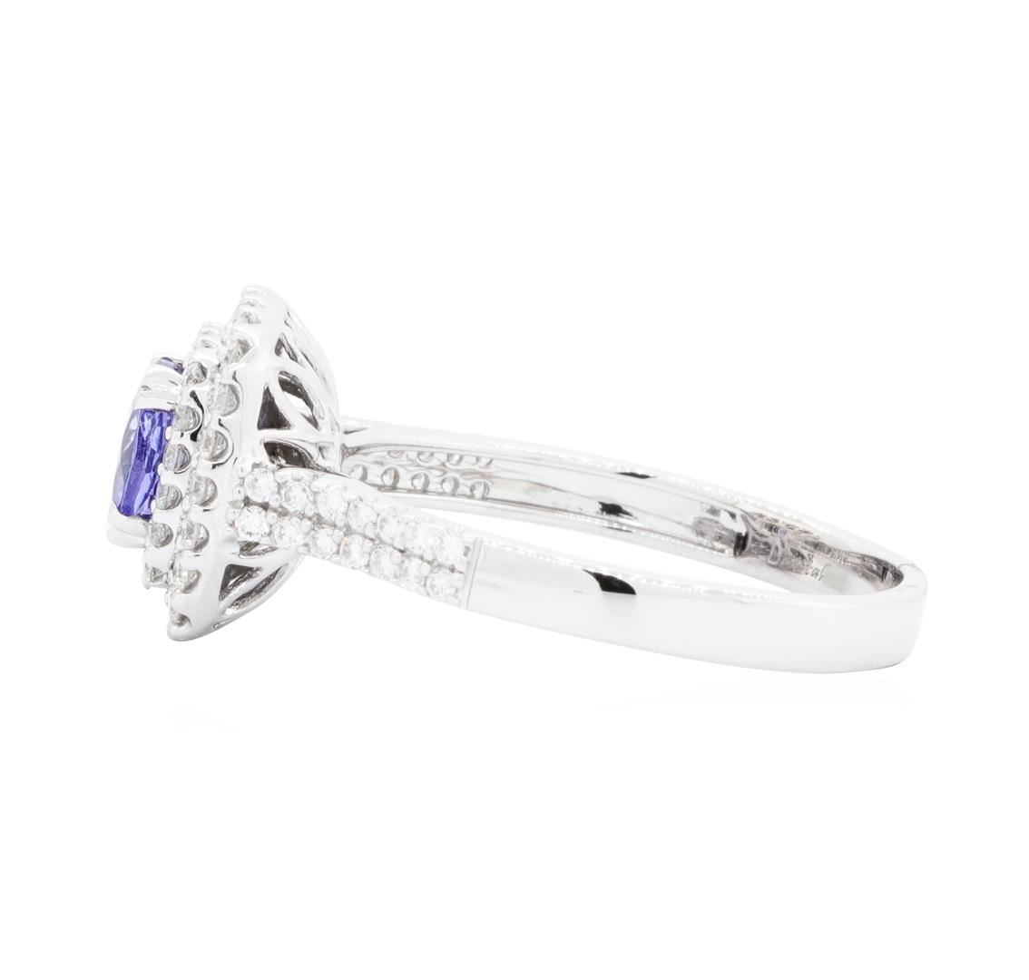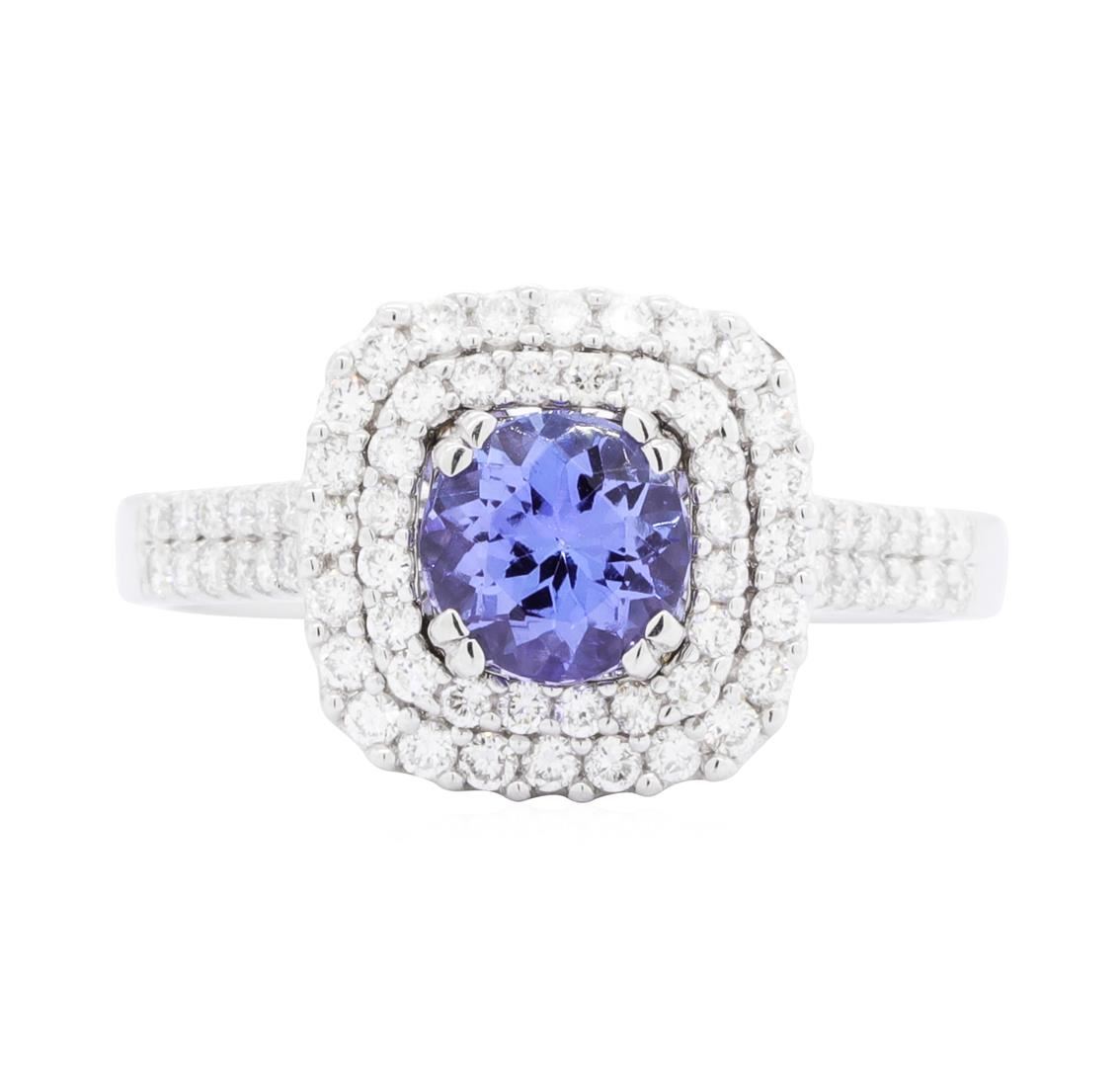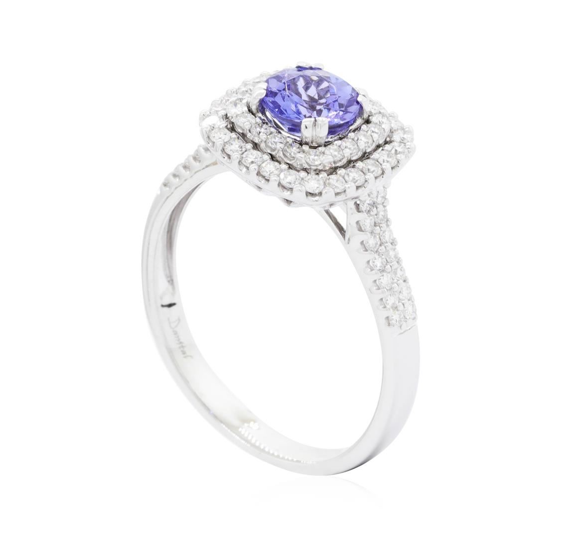 One electronically tested 18KT white gold Ladies cast fashion ring with a double cushion halo with a bright polish finish. The featured Ladies ring has a shank measuring 2.80 millimeters wide. Identified with markings of '750'. Condition is new, good workmanship. Containing: One prong set round modified brilliant cut natural tanzanite, measuring 6.45 - 6.42 x 4.26 mm, (depth est.) approximate weight of 1.16ct., clarity is slightly included, medium, moderately strong, violetish blue color, (GIA vB 5/4), cut is good. Transmitting light with a minimum of distortion, transparent. Colored gemstones are presumed to have been subjected to commonly used enhancement processes. Graded in the setting. Twenty-Four prong set round brilliant cut diamonds, measuring 1.50 - 1.40 x 0.90mm (depth est.) approximate total weight of 24 Stones = 0.28ct. Graded in the setting. Color H - I Clarity SI-1 to SI-2 Cut Good Forty-Eight prong set round brilliant cut diamonds, measuring 1.30 - 1.20 x 0.78mm (depth est.) approximate total weight of 48 Stones = 0.36ct. Graded in the setting. Color H - I Clarity SI-1 to SI-3 Cut Good. Total Weight of Colored Stones 1.16ct. Total Weight of Diamonds 0.64ct. Total Weight of Ring 4.80gm GAS Appraised.