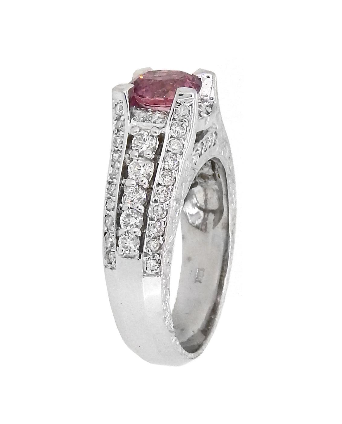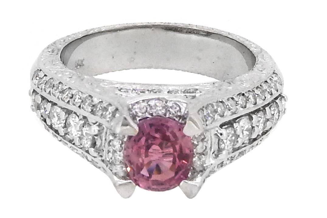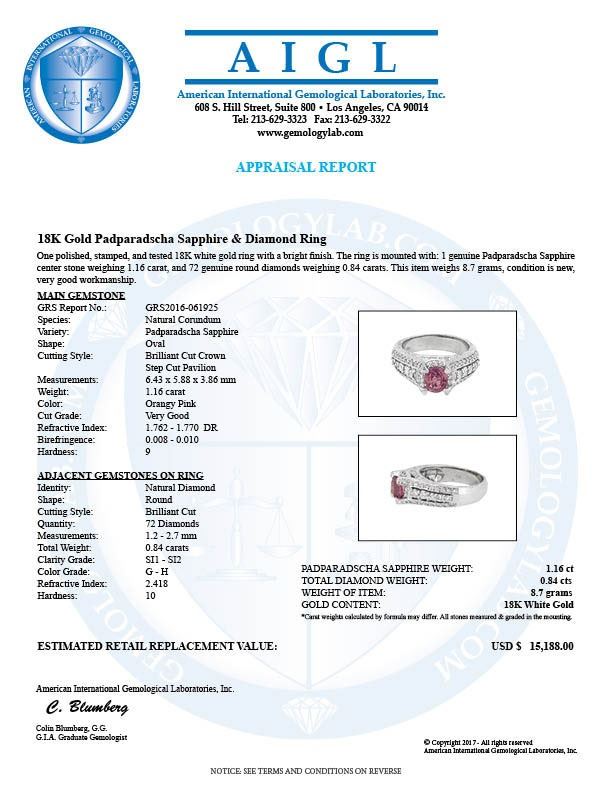 One 18KT White Gold 1.16ct Padparadscha Sapphire and Diamond Ring. (1) Padparadscha Sapphire with a total weight of 1.16cts. (72) Diamonds with a total weight of 0.84cts with a color of G-H and clarity of SI-1 to SI-2. Total weight of this ring is 8.7 grams.