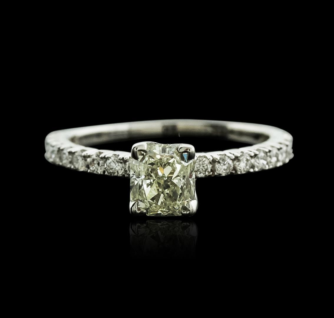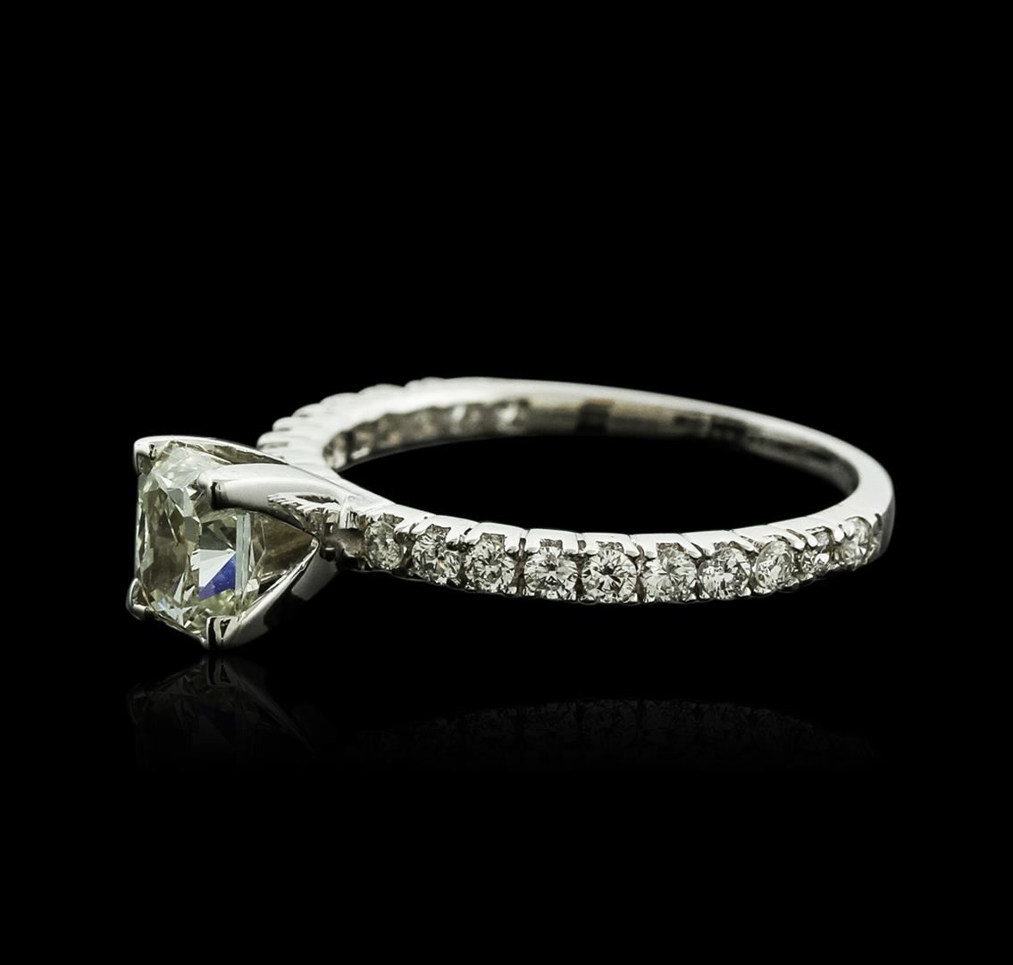 One electronically tested 18KT white gold ladies combination cast & assembled diamond engagement ring with a flat shank with a bright polish finish. Condition is new. Containing: One prong set radiant shaped cut diamond, measuring 5.77 x 5.08 x 3.81mm (depth est.) approximate weight of 0.92ct. Clarity: VS-2. Color: L, Cut is Good. Twenty prong set round brilliant cut diamonds, measuring 1.50 - 1.50 x 0.90mm (depth est.) approximate total weight of 20 Stones = 0.25ct. Clarity: SI-2. Color: H - I, Cut is Good. All diamonds are graded in the mounting, unless otherwise stated. Total Weight of Diamonds 1.16ct. Total Weight of Engagement Ring 2.10 grams. GGL Appraised at $5,515.00.