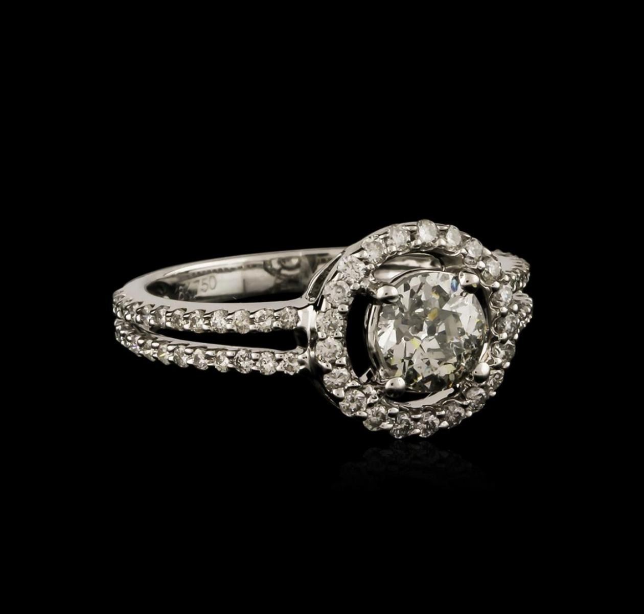 One electronically tested 18KT white gold ladies cast diamond engagement ring with a bright polish finish. Identified with markings of "18K". Condition is new. Containing: One prong set Old European cut diamond, measuring 6.30 - 6.30 x 3.48mm (depth est.) approximate weight of 0.84ct. Clarity: I-2. Color: K. Fifty-Two prong set round brilliant cut diamonds, measuring 1.20 - 1.20 x 0.72mm (depth est.) approximate total weight of 52 Stones = 0.33ct. Clarity: SI-2 to I-1. Color: I, Cut is Good. All diamonds are graded in the mounting, unless otherwise stated. Total Weight of Diamonds 1.17ct. Total Weight of Engagement Ring 4.00 grams. GGL Appraised.