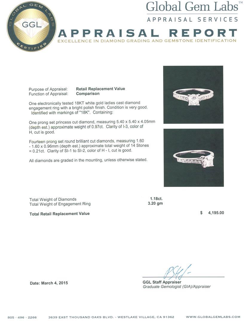 One electronically tested 18KT white gold ladies cast diamond engagement ring with a bright polish finish. Identified with markings of "18K". Condition is very good. Containing: One prong set princess cut diamond, measuring 5.40 x 5.40 x 4.05mm (depth est.) approximate weight of 0.97ct. Clarity: I-3. Color: H, Cut is Good. Fourteen prong set round brilliant cut diamonds, measuring 1.60 - 1.60 x 0.96mm (depth est.) approximate total weight of 14 Stones = 0.21ct. Clarity: SI-1 to SI-2. Color: H - I, Cut is Good. All diamonds are graded in the mounting, unless otherwise stated. Total Weight of Diamonds 1.18ct. Total Weight of Engagement Ring 3.20 grams. GGL Appraised at $4,195.00.