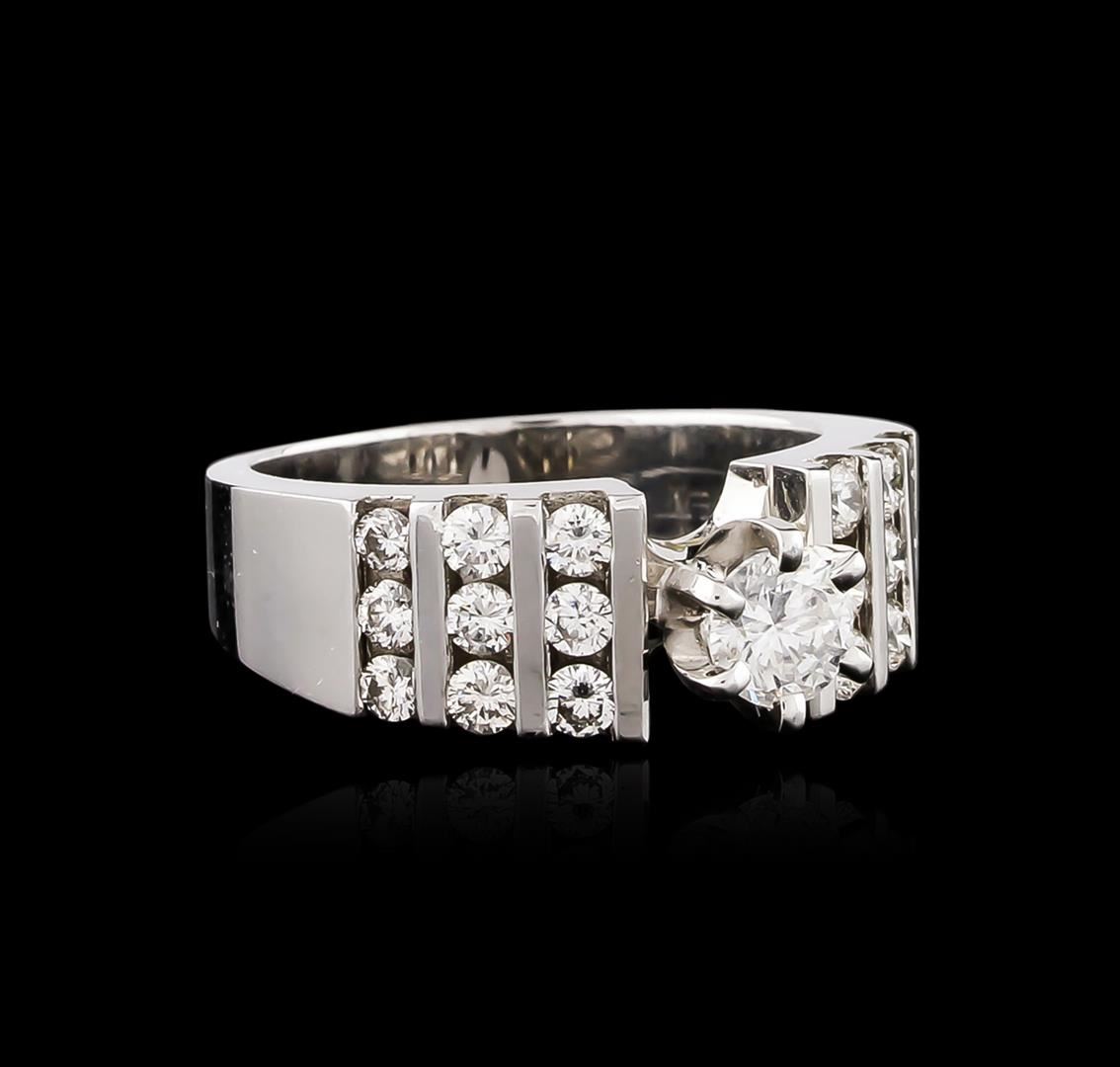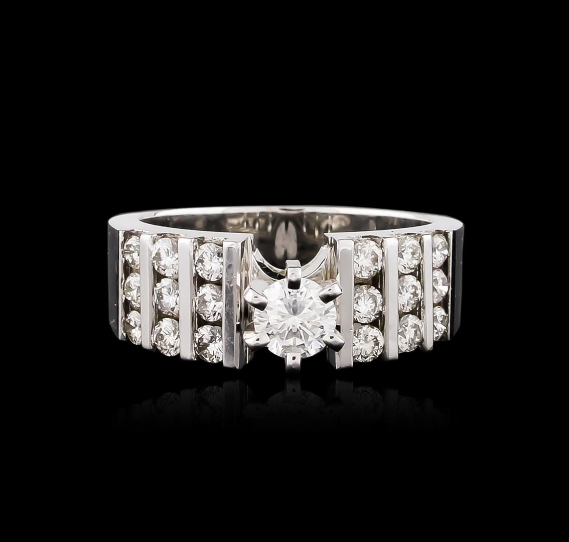 One electronically tested 18KT white gold ladies cast diamond unity ring with a bright polish finish. The featured diamond is supported by tapering diamond set shoulders, completed by a three and one-half millimeter wide band. Identified with markings of "18K". Condition is good. Containing: One prong set round brilliant cut diamond, measuring 4.50 - 4.95 x 2.85mm (depth est.) approximate weight of 0.48ct. Graded in the setting. Clarity: SI-2. Color: 60.3%. Table 63.4%. Eighteen channel set round brilliant cut diamonds, measuring 2.20 - 2.00 x 1.26mm (depth est.) approximate total weight of 18 Stones = 0.71ct. Graded in the setting. Clarity: VVS-2 to VS-2. Color: G - I. Total Weight of Diamonds 1.19ct. Total Weight of Ring 7.51 grams. AIG Appraised at $6,790.00.