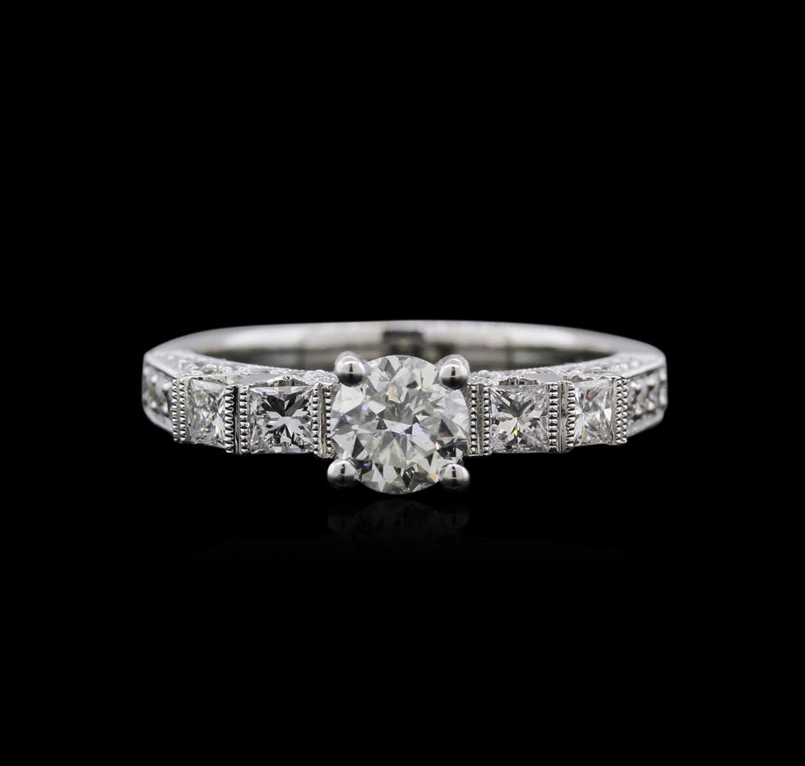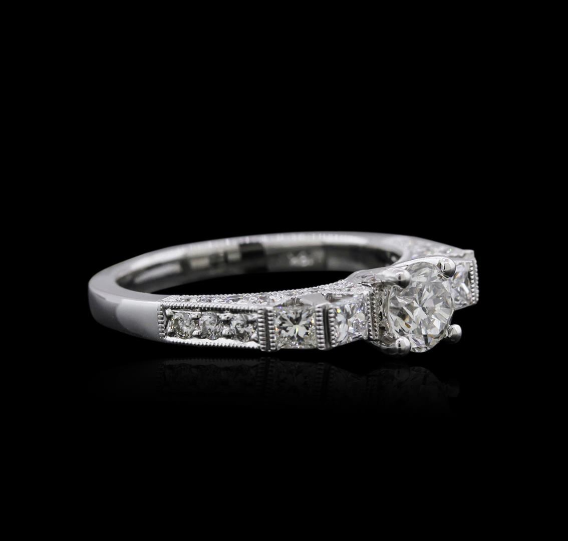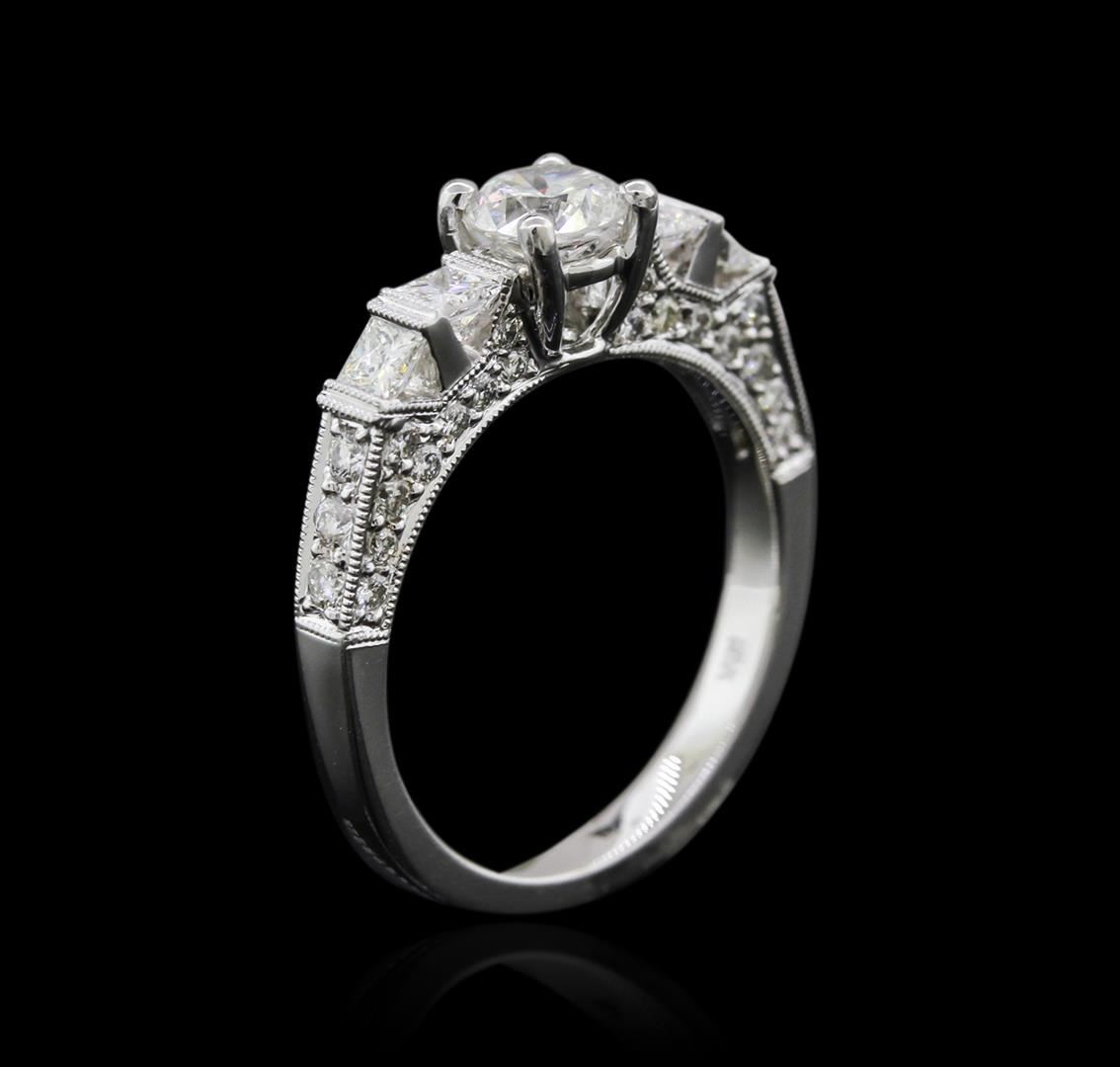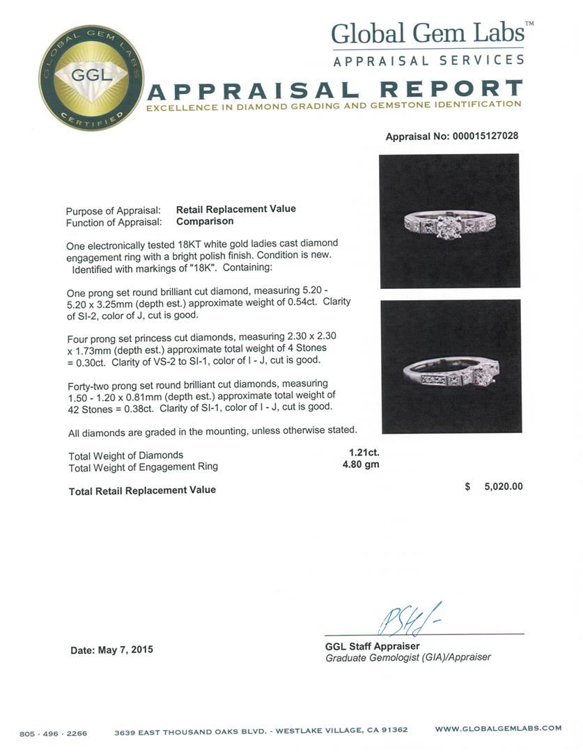 One electronically tested 18KT white gold ladies cast diamond engagement ring with a bright polish finish. Identified with markings of "18K". Condition is new. Containing: One prong set round brilliant cut diamond, measuring 5.20 - 5.20 x 3.25mm (depth est.) approximate weight of 0.54ct. Clarity: SI-2. Color: J, Cut is Good. Four prong set princess cut diamonds, measuring 2.30 x 2.30 x 1.73mm (depth est.) approximate total weight of 4 Stones = 0.30ct. Clarity: VS-2 to SI-1. Color: I - J, Cut is Good. Forty-Two prong set round brilliant cut diamonds, measuring 1.50 - 1.20 x 0.81mm (depth est.) approximate total weight of 42 Stones = 0.38ct. Clarity: SI-1. Color: I - J, Cut is Good. All diamonds are graded in the mounting, unless otherwise stated. Total Weight of Diamonds 1.21ct. Total Weight of Engagement Ring 4.80 grams. GGL Appraised at $5,020.00.