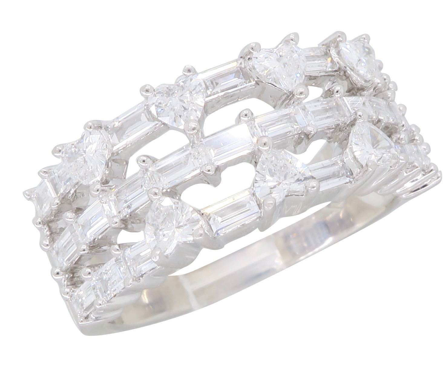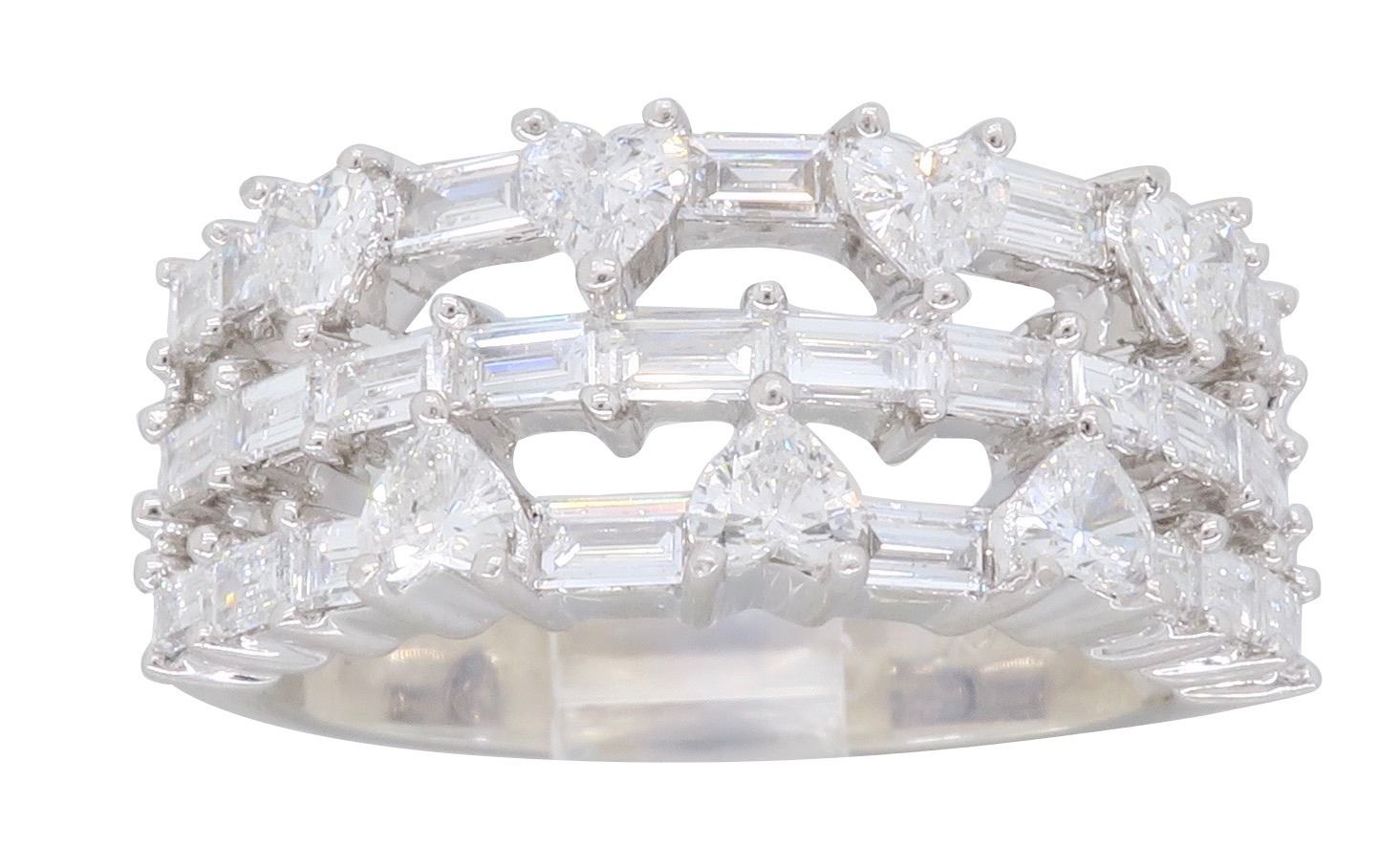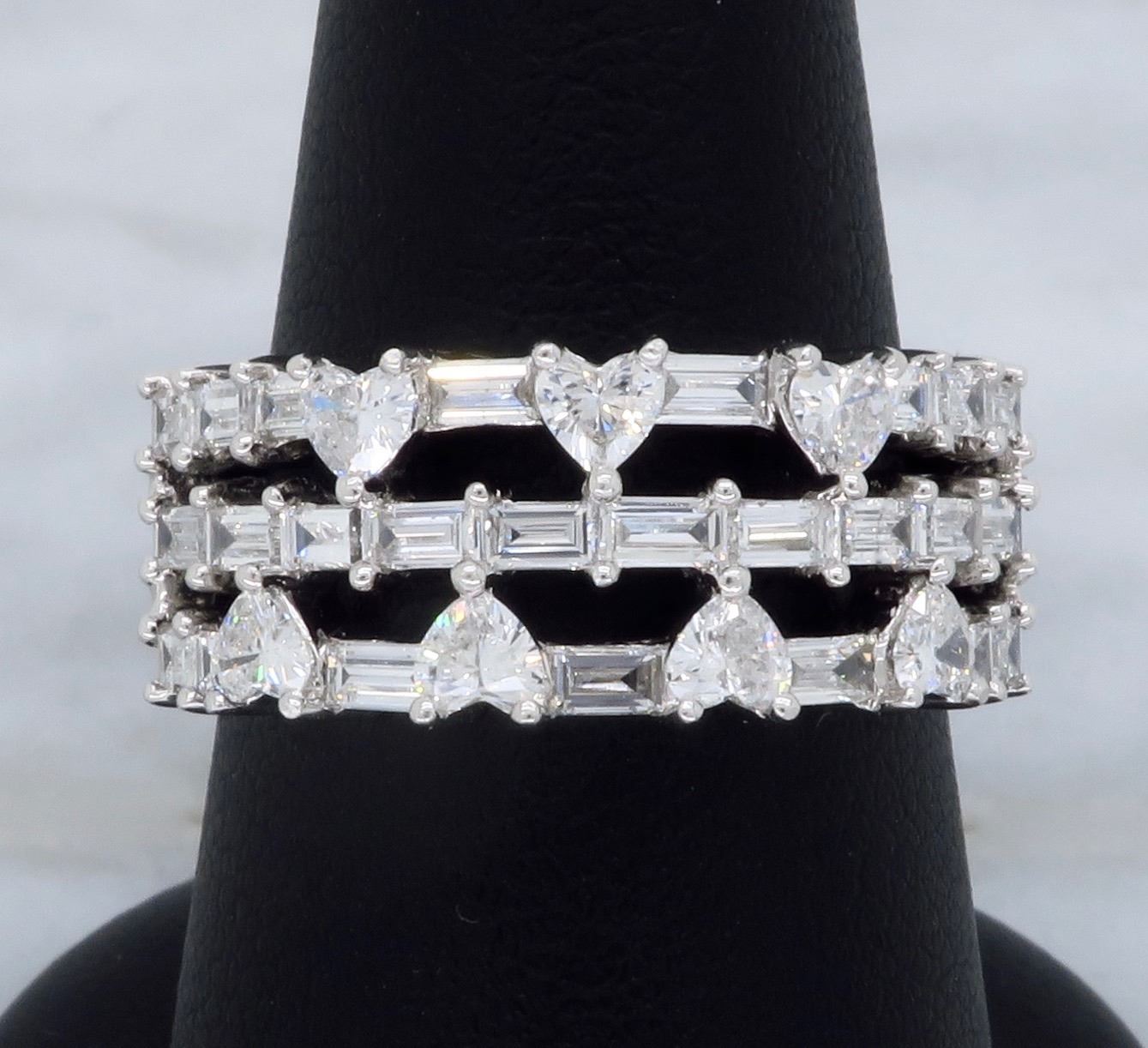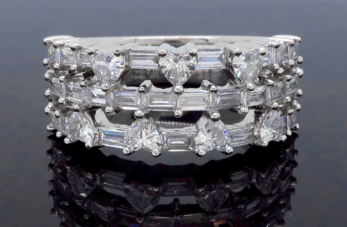 One 18KT White Gold 1.25ctw Diamond Ring. Heart and Baguette Diamonds with a total weight of 1.25cts with a color of F-G and clarity of VS-2 to SI-1. Total weight of this ring is 7.7 grams.