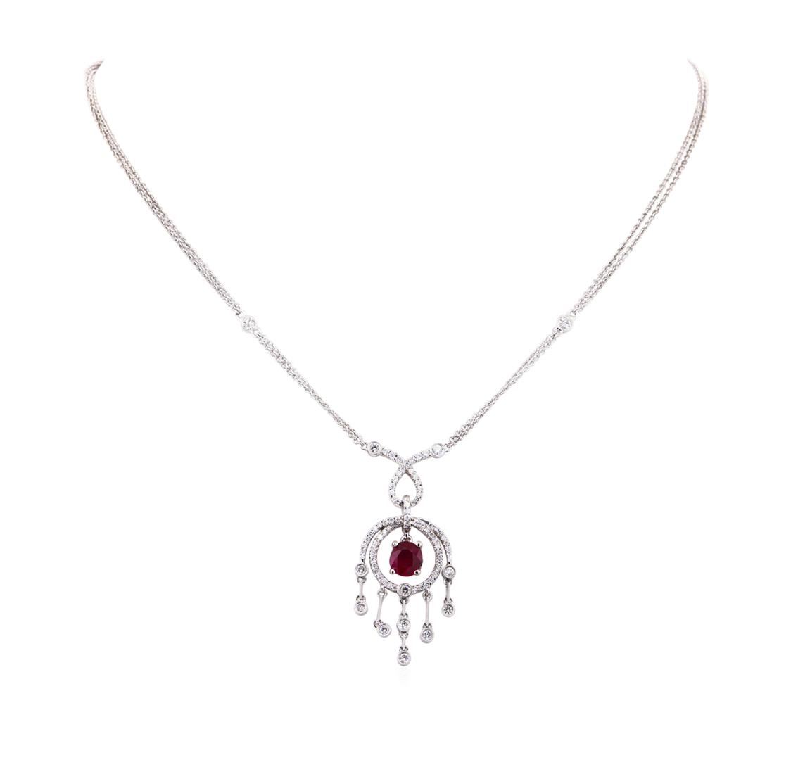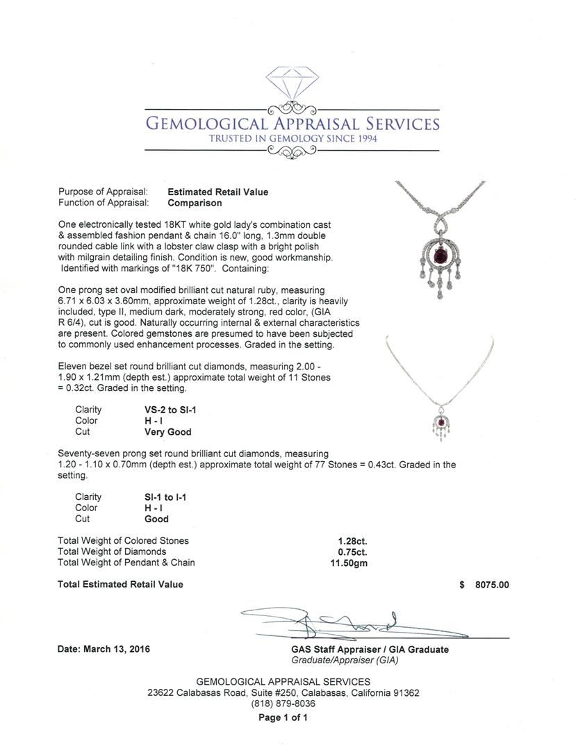 One electronically tested 18KT white gold lady's combination cast & assembled fashion pendant & chain 16.0" long, 1.3mm double rounded cable link with a lobster claw clasp with a bright polish with milgrain detailing finish. Identified with markings of "18K 750". Condition is new, good workmanship. Containing: One prong set oval modified brilliant cut natural ruby, measuring 6.71 x 6.03 x 3.60mm, approximate weight of 1.28ct., clarity is heavily included, type II, medium dark, moderately strong, red color, (GIA R 6/4), cut is good. Naturally occurring internal & external characteristics are present. Colored gemstones are presumed to have been subjected to commonly used enhancement processes. Graded in the setting. Eleven bezel set round brilliant cut diamonds, measuring 2.00 - 1.90 x 1.21mm (depth est.) approximate. Total Weight of 11 Stones = 0.32ct. Graded in the setting. Clarity: VS-2 to SI-1. Color: H - I, Cut Very Good. Seventy-Seven prong set round brilliant cut diamonds, measuring 1.20 - 1.10 x 0.70mm (depth est.) approximate. Total Weight of 77 Stones = 0.43ct. Graded in the setting. Clarity: SI-1 to I-1. Color: H - I, Cut Good. Total Weight of Colored Stones 1.28ct. Total Weight of Diamonds 0.75ct. Total Weight of Pendant & Chain 11.50 grams. GAS Appraised at $8,075.00.