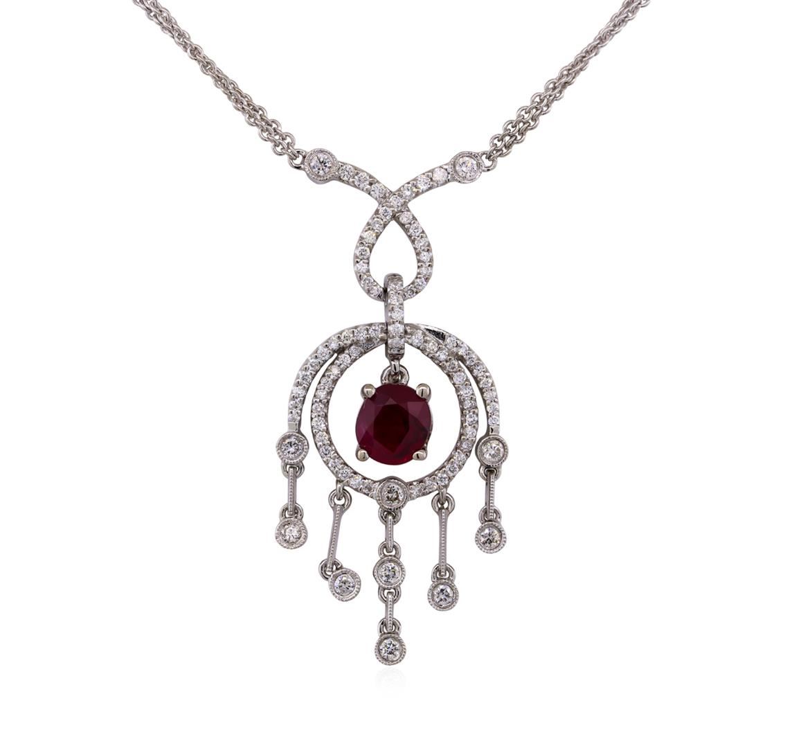 One electronically tested 18KT white gold lady's combination cast & assembled fashion pendant & chain 16.0" long, 1.3mm double rounded cable link with a lobster claw clasp with a bright polish with milgrain detailing finish. Identified with markings of "18K 750". Condition is new, good workmanship. Containing: One prong set oval modified brilliant cut natural ruby, measuring 6.71 x 6.03 x 3.60mm, approximate weight of 1.28ct., clarity is heavily included, type II, medium dark, moderately strong, red color, (GIA R 6/4), cut is good. Naturally occurring internal & external characteristics are present. Colored gemstones are presumed to have been subjected to commonly used enhancement processes. Graded in the setting. Eleven bezel set round brilliant cut diamonds, measuring 2.00 - 1.90 x 1.21mm (depth est.) approximate. Total Weight of 11 Stones = 0.32ct. Graded in the setting. Clarity: VS-2 to SI-1. Color: H - I, Cut Very Good. Seventy-Seven prong set round brilliant cut diamonds, measuring 1.20 - 1.10 x 0.70mm (depth est.) approximate. Total Weight of 77 Stones = 0.43ct. Graded in the setting. Clarity: SI-1 to I-1. Color: H - I, Cut Good. Total Weight of Colored Stones 1.28ct. Total Weight of Diamonds 0.75ct. Total Weight of Pendant & Chain 11.50 grams. GAS Appraised at $8,075.00.