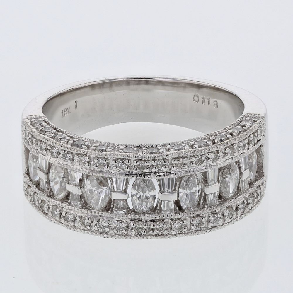 One 18KT White Gold 1.28ctw Diamond Ring. (7) Marquise Diamonds with a total weight of 0.61cts. (58) Round Diamonds with a total weight of 0.47cts. (12) Baguette Diamonds with a total weight of 0.20cts. Total weight of this ring is 8.29 grams.