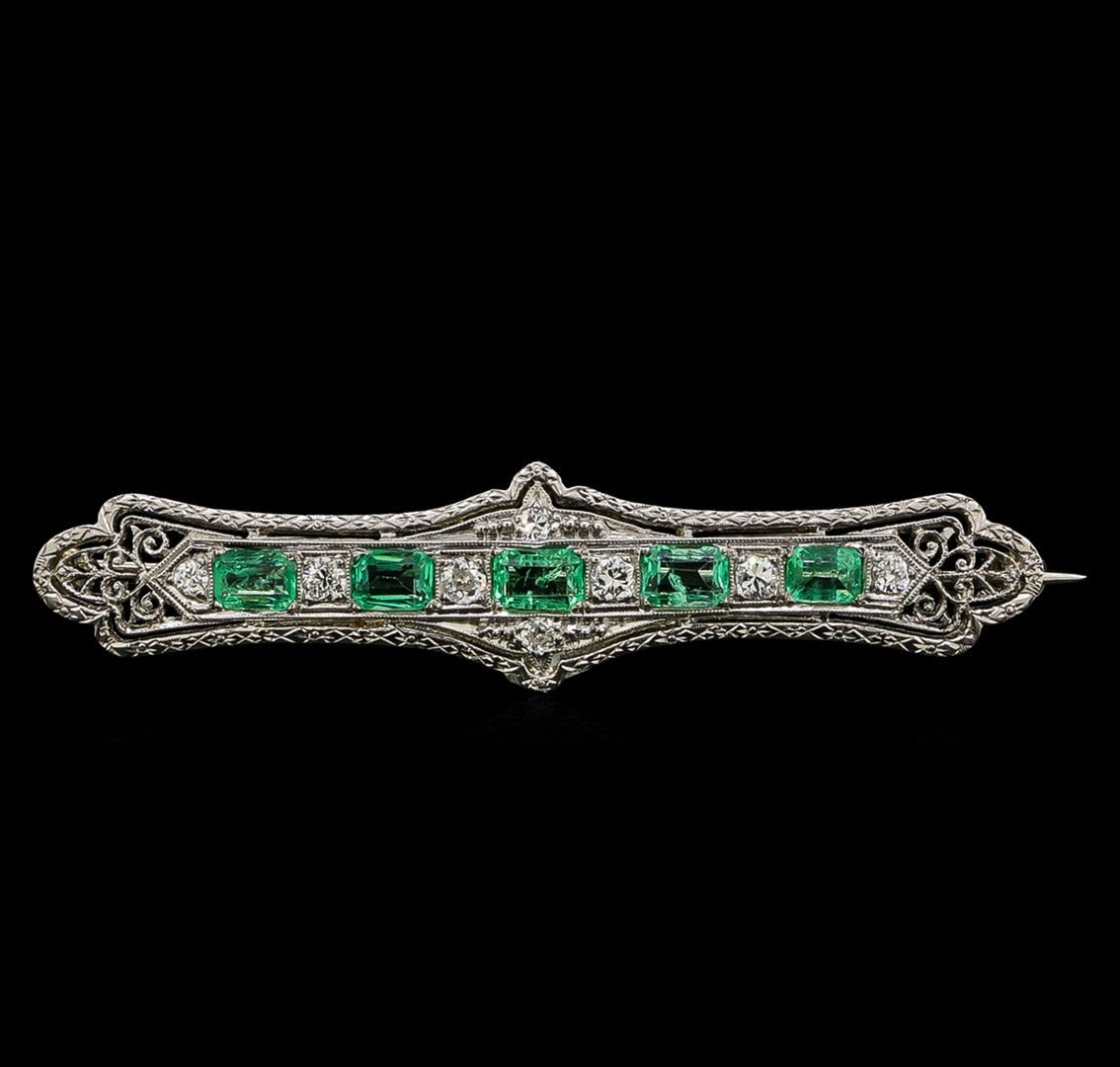 One electronically tested 18KT white gold ladies combination cast & assembled emerald and diamond pin with a bright polish finish. Condition is very good. Containing: Five prong set emerald standard step cut natural emeralds, measuring 4.50 x 3.50 x 2.28mm, approximate total weight of 1.30ct., clarity is slightly included, type III, light, very slightly grayish, green color, (GIA G 3/3), cut is good. Eight prong set Old European cut diamonds, measuring 2.50 - 2.50 x 1.55mm (depth est.) approximate total weight of 8 Stones = 0.47ct. Clarity: SI-1 to SI-2. Color: G - H. Colored gemstones are presumed to have been subjected to commonly used enhancement processes. All diamonds and colored gemstones are graded in the mounting, unless otherwise stated. Total Weight of Colored Stones 1.30ct. Total Weight of Diamonds 0.47ct. Total Weight of Pin 7.00 grams. GGL Appraised at $4,005.00.