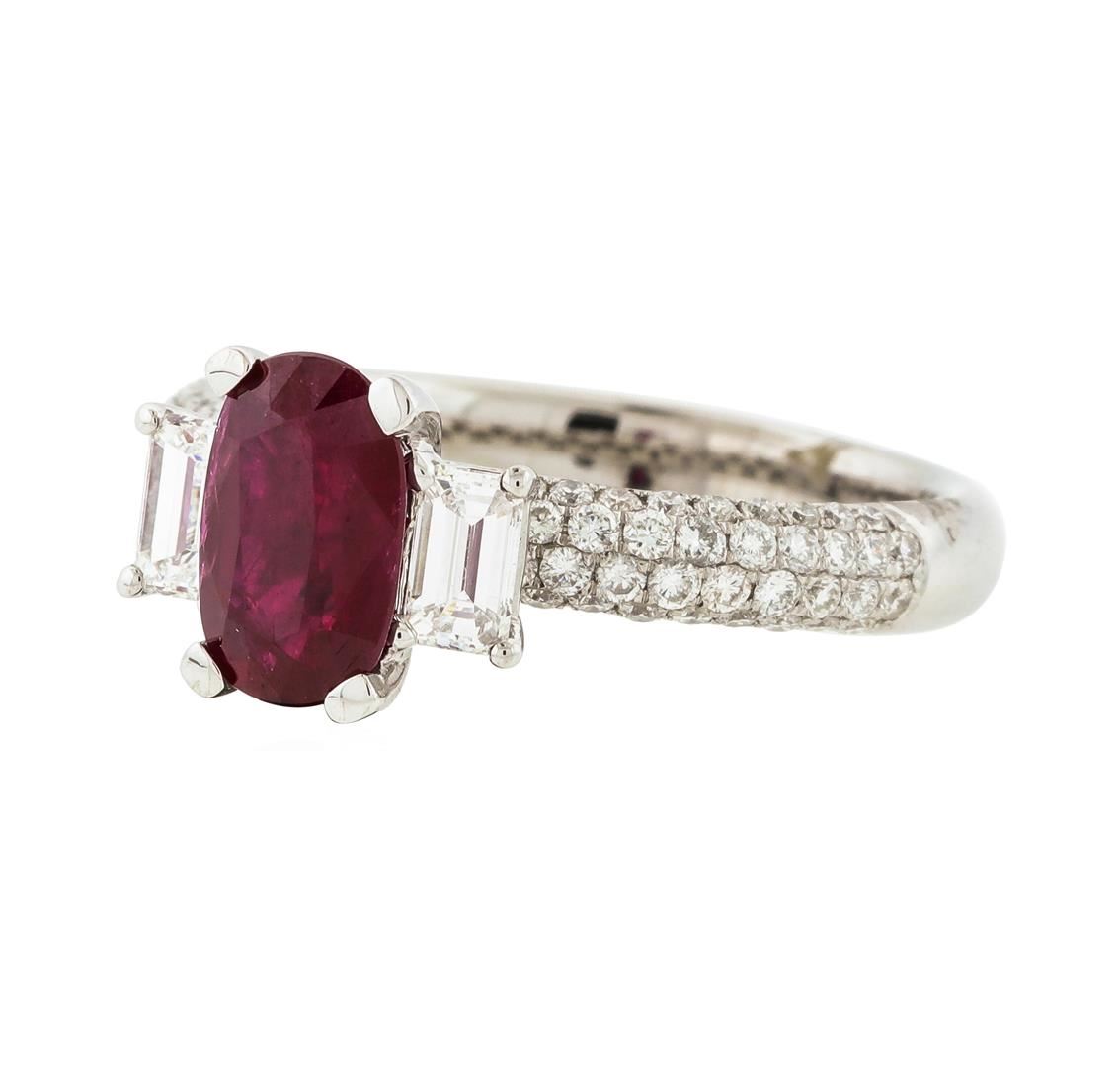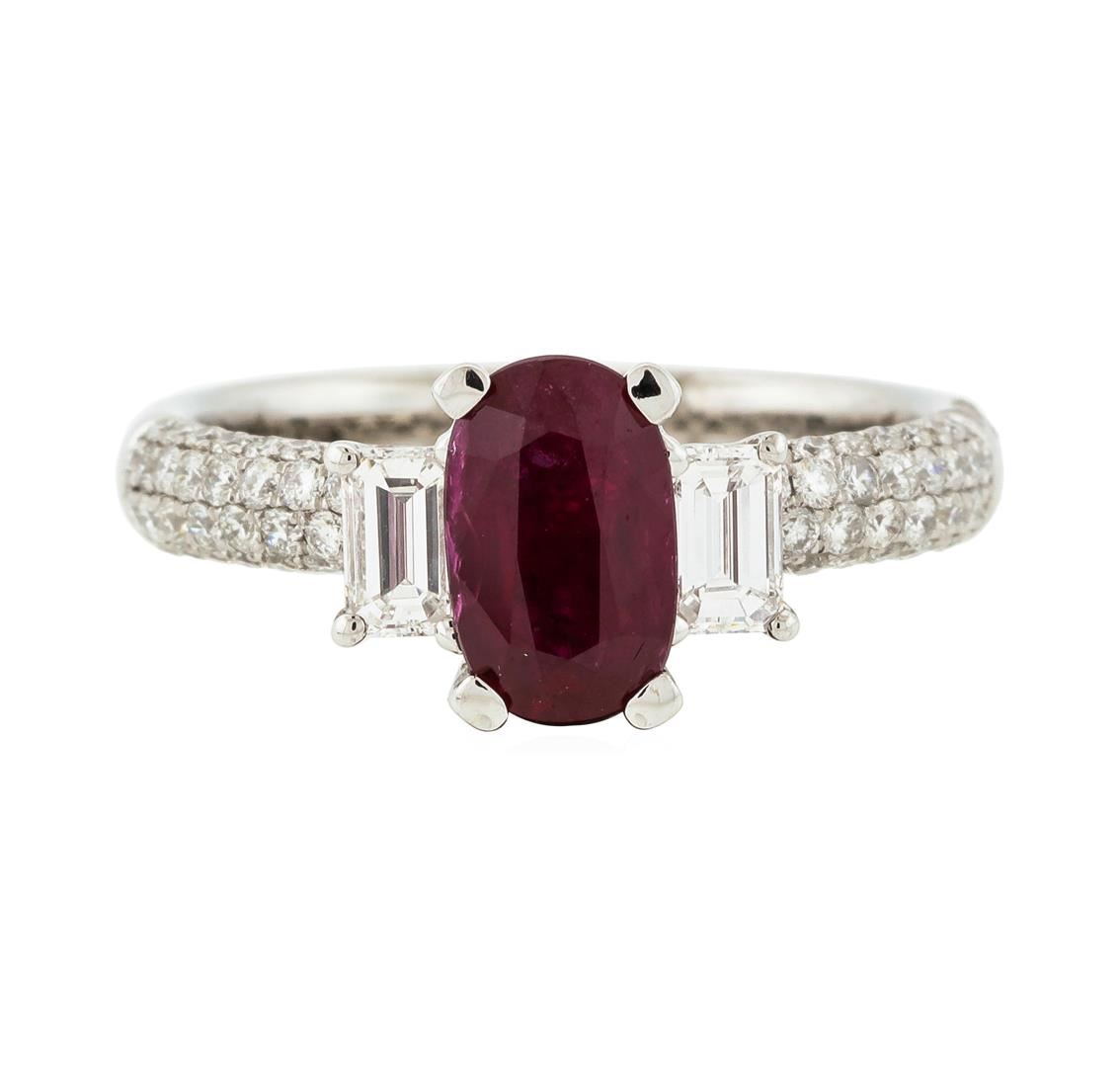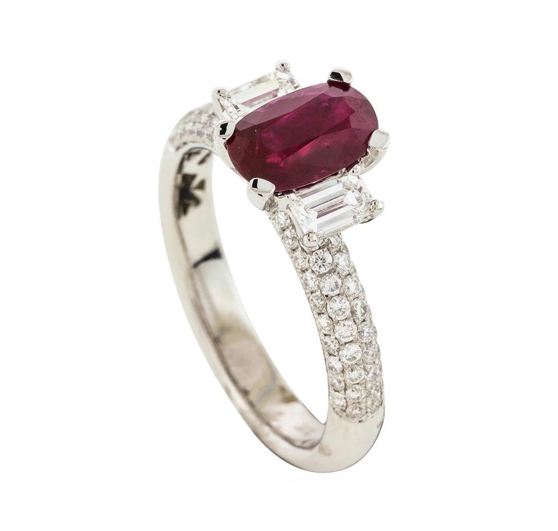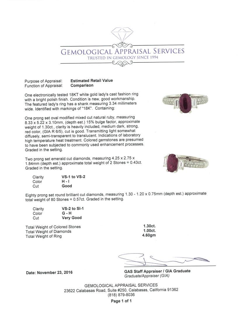 One electronically tested 18KT white gold lady's cast fashion ring with a bright polish finish. The featured lady's ring has a shank measuring 3.34 millimeters wide. Identified with markings of "18K". Condition is new, good workmanship. Containing: One prong set oval modified mixed cut natural ruby, measuring 8.33 x 5.22 x 3.10mm, (depth est.) 15%. bulge factor, approximate weight of 1.30ct., clarity is heavily included, medium dark, strong, red color, (GIA R 6/5), cut is good. Transmitting light somewhat diffusely, semi-transparent to translucent. Indications of laboratory high temperature heat treatment. Colored gemstones are presumed to have been subjected to commonly used enhancement processes. Graded in the setting. Two prong set emerald cut diamonds, measuring 4.25 x 2.75 x 1.84mm (depth est.) approximate total weight of 2 Stones = 0.43ct. Graded in the setting. Clarity: VS-1 to VS-2. Color: H - ICut Good Eighty prong set round brilliant cut diamonds, measuring 1.30 - 1.20 x 0.75mm (depth est.) approximate total weight of 80 Stones = 0.57ct. Graded in the setting. Clarity: VS-2 to SI-1. Color: G - HCut Very Good. Total Weight of Colored Stones 1.30ct. Total Weight of Diamonds 1.00ct. Total Weight of Ring 4.60gm. GAS Appraised.
