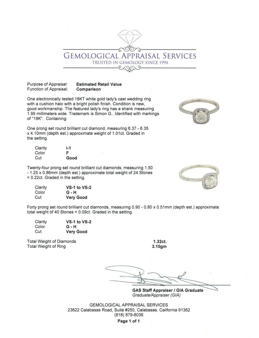 One electronically tested 18KT white gold lady's cast wedding ring with a cushion halo with a bright polish finish. The featured lady's ring has a shank measuring 1.95 millimeters wide. Trademark is Simon G. Identified with markings of "18K". Condition is new, good workmanship. Containing: One prong set round brilliant cut diamond, measuring 6.37 - 6.35 x 4.10mm (depth est.) approximate weight of 1.01ct. Graded in the setting. Clarity: I-1. Color: F, Cut Good. Twenty-Four prong set round brilliant cut diamonds, measuring 1.50 - 1.25 x 0.86mm (depth est.) approximate. Total Weight of 24 Stones = 0.22ct. Graded in the setting. Clarity: VS-1 to VS-2. Color: G - H, Cut Very Good. Forty prong set round brilliant cut diamonds, measuring 0.90 - 0.80 x 0.51mm (depth est.) approximate. Total Weight of 40 Stones = 0.09ct. Graded in the setting. Clarity: VS-1 to VS-2. Color: G - H, Cut Very Good. Total Weight of Diamonds 1.32ct. Total Weight of Ring 3.10 grams. GAS Appraised.