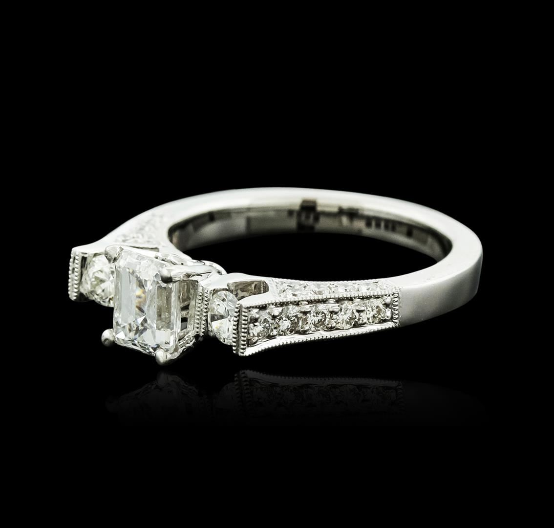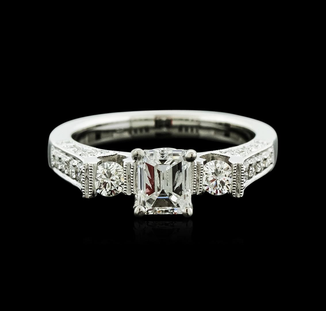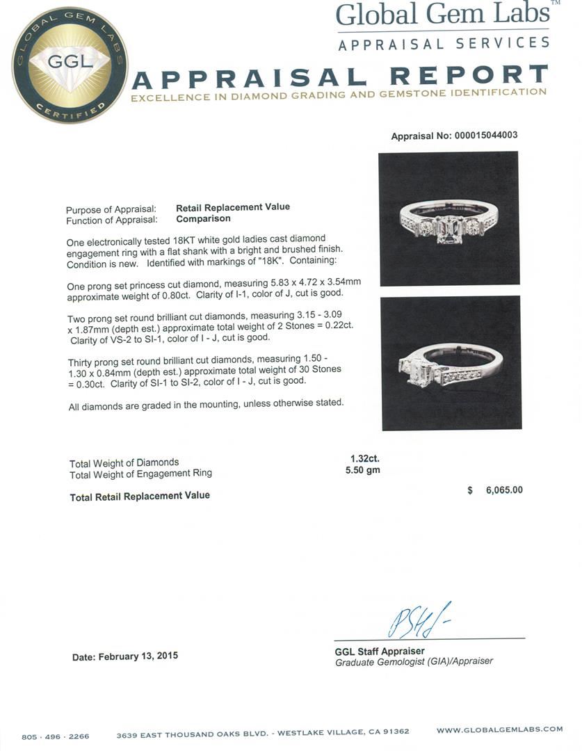 One electronically tested 18KT white gold ladies cast diamond engagement ring with a flat shank with a bright and brushed finish. Identified with markings of "18K". Condition is new. Containing: One prong set princess cut diamond, measuring 5.83 x 4.72 x 3.54mm approximate weight of 0.80ct. Clarity: I-1. Color: J, Cut is Good. Two prong set round brilliant cut diamonds, measuring 3.15 - 3.09 x 1.87mm (depth est.) approximate total weight of 2 Stones = 0.22ct. Clarity: VS-2 to SI-1. Color: I - J, Cut is Good. Thirty prong set round brilliant cut diamonds, measuring 1.50 - 1.30 x 0.84mm (depth est.) approximate total weight of 30 Stones = 0.30ct. Clarity: SI-1 to SI-2. Color: I - J, Cut is Good. All diamonds are graded in the mounting, unless otherwise stated. Total Weight of Diamonds 1.32ct. Total Weight of Engagement Ring 5.50 grams. GGL Appraised at $6,065.00.