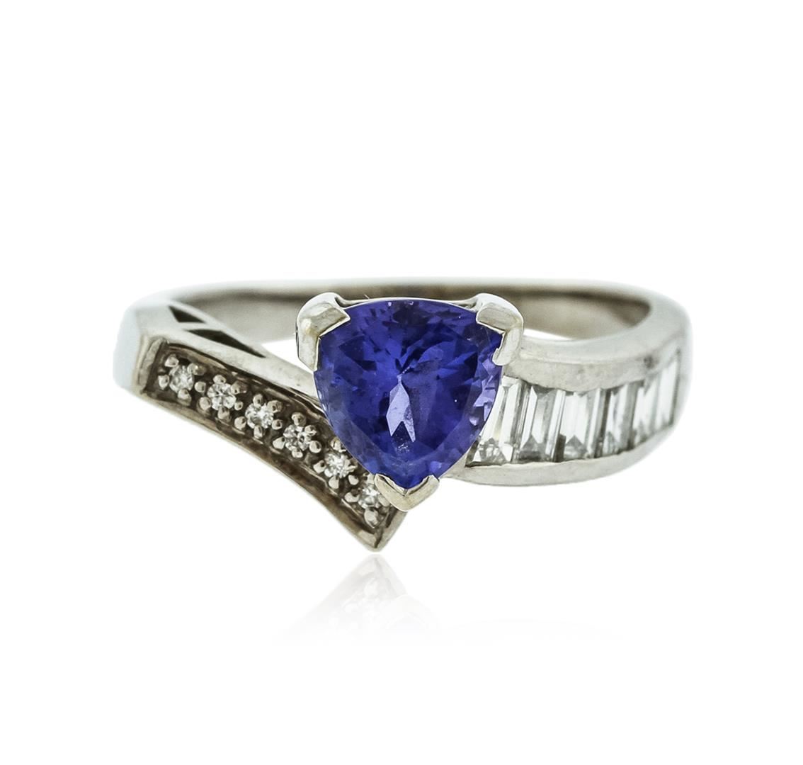 One electronically tested 18KT white gold ladies cast tanzanite and diamond ring with a bright polish finish. Identified with markings of "18K". Condition is new. Containing: One prong set triangle modified brilliant cut natural tanzanite, measuring 7.00 x 7.00 x 4.55mm, approximate weight of 1.34ct., clarity is eye clean, type I, medium light, very slightly grayish, bluish violet color, (GIA bV 4/3), cut is good. Six prong set round brilliant cut diamonds, measuring 1.20 - 1.20 x 0.72mm (depth est.) approximate total weight of 6 Stones = 0.04ct. Clarity: SI-2 to I-1. Color: I - J. Six channel set baguette cut diamonds, measuring from 2.50 x 1.50 x 1.28mm (depth est.) to 3.20 x 2.00 x 1.70mm (depth est.) approximate total weight of 6 Stones = 0.41ct. Clarity: VS-2 to SI-1. Color: I - J. Colored gemstones are presumed to have been subjected to commonly used enhancement processes. All diamonds and colored gemstones are graded in the mounting, unless otherwise stated. Total Weight of Colored Stones 1.34ct. Total Weight of Diamonds 0.45ct. Total Weight of Ring 4.80 grams. GGL Appraised at $2,845.00.