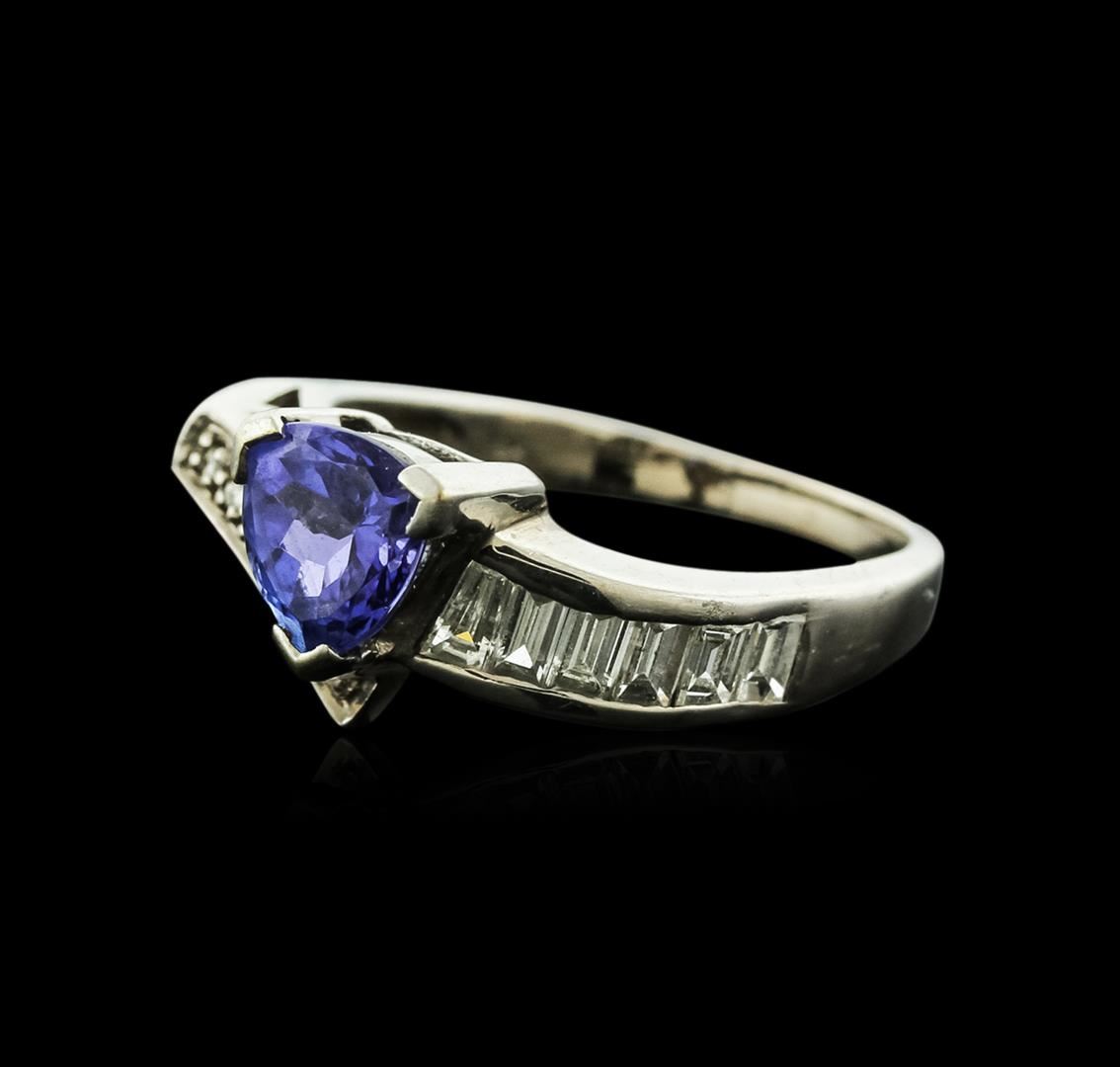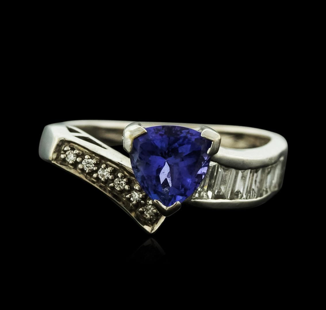 One electronically tested 18KT white gold ladies cast tanzanite and diamond ring with a bright polish finish. Identified with markings of "18K". Condition is new. Containing: One prong set triangle modified brilliant cut natural tanzanite, measuring 7.00 x 7.00 x 4.55mm, approximate weight of 1.34ct., clarity is eye clean, type I, medium light, very slightly grayish, bluish violet color, (GIA bV 4/3), cut is good. Six prong set round brilliant cut diamonds, measuring 1.20 - 1.20 x 0.72mm (depth est.) approximate total weight of 6 Stones = 0.04ct. Clarity: SI-2 to I-1. Color: I - J. Six channel set baguette cut diamonds, measuring from 2.50 x 1.50 x 1.28mm (depth est.) to 3.20 x 2.00 x 1.70mm (depth est.) approximate total weight of 6 Stones = 0.41ct. Clarity: VS-2 to SI-1. Color: I - J. Colored gemstones are presumed to have been subjected to commonly used enhancement processes. All diamonds and colored gemstones are graded in the mounting, unless otherwise stated. Total Weight of Colored Stones 1.34ct. Total Weight of Diamonds 0.45ct. Total Weight of Ring 4.80 grams. GGL Appraised at $2,845.00.