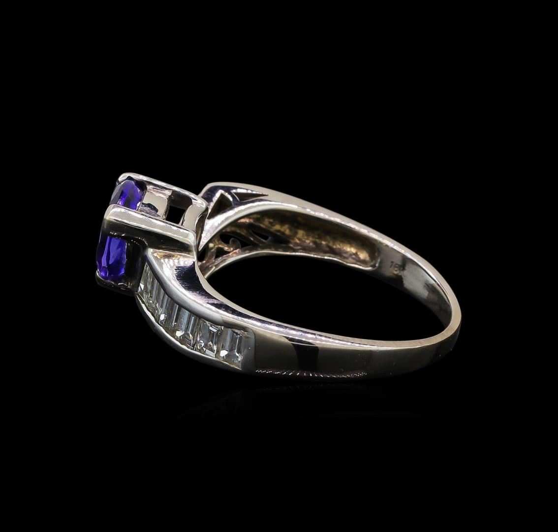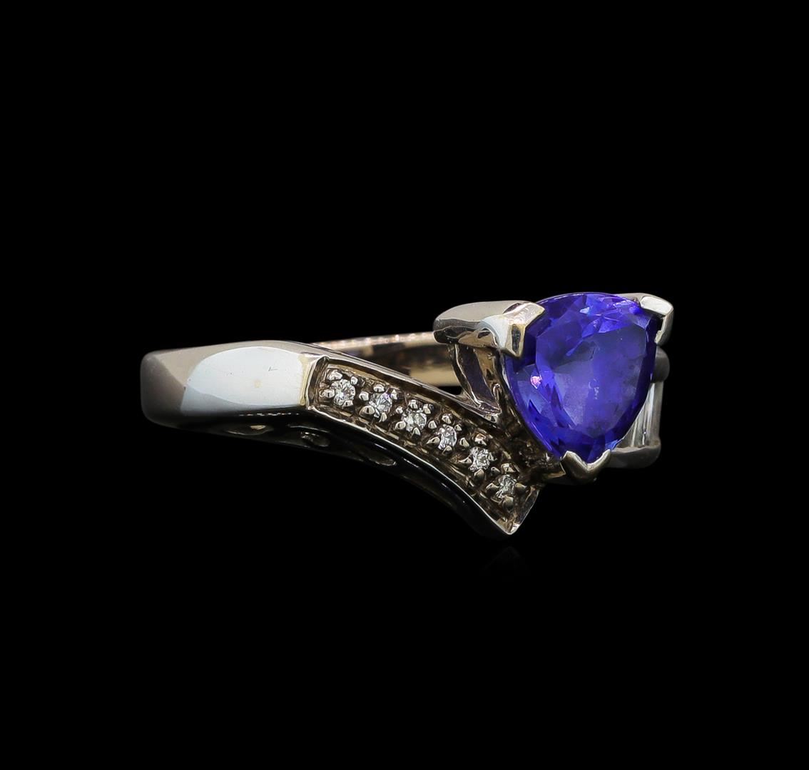 One electronically tested 18KT white gold ladies cast tanzanite and diamond ring with a bright polish finish. Identified with markings of "18K". Condition is new. Containing: One prong set triangle modified brilliant cut natural tanzanite, measuring 7.00 x 7.00 x 4.55mm, approximate weight of 1.34ct., clarity is eye clean, type I, medium light, very slightly grayish, bluish violet color, (GIA bV 4/3), cut is good. Six prong set round brilliant cut diamonds, measuring 1.20 - 1.20 x 0.72mm (depth est.) approximate total weight of 6 Stones = 0.04ct. Clarity: SI-2 to I-1. Color: I - J. Six channel set baguette cut diamonds, measuring from 2.50 x 1.50 x 1.28mm (depth est.) to 3.20 x 2.00 x 1.70mm (depth est.) approximate total weight of 6 Stones = 0.41ct. Clarity: VS-2 to SI-1. Color: I - J. Colored gemstones are presumed to have been subjected to commonly used enhancement processes. All diamonds and colored gemstones are graded in the mounting, unless otherwise stated. Total Weight of Colored Stones 1.34ct. Total Weight of Diamonds 0.45ct. Total Weight of Ring 4.80 grams. GGL Appraised.
