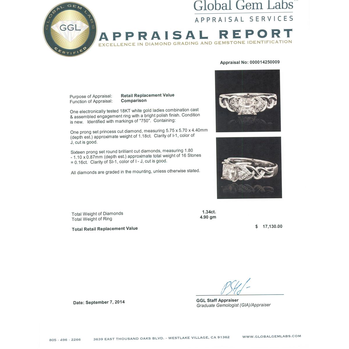 One electronically tested 18KT white gold ladies combination cast & assembled engagement ring with a bright polish finish. Identified with markings of "750". Condition is new. Containing: One prong set princess cut diamond, measuring 5.75 x 5.70 x 4.40mm (depth est.) approximate weight of 1.18ct. Clarity: I-1. Color: J, Cut is Good. Sixteen prong set round brilliant cut diamonds, measuring 1.80 - 1.10 x 0.87mm (depth est.) approximate total weight of 16 Stones = 0.16ct. Clarity: SI-1. Color: I - J, Cut is Good. All diamonds are graded in the mounting, unless otherwise stated. Total Weight of Diamonds 1.34ct. Total Weight of Ring 4.90 grams. GGL Appraised at $17,130.00.