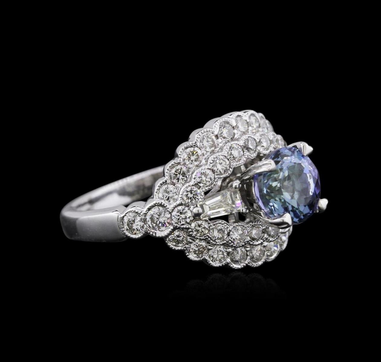 One electronically tested 18KT white gold ladies cast tanzanite and diamond ring with a bright polish finish. Identified with markings of "18K". Condition is new. Containing: One prong set round modified brilliant cut natural tanzanite, measuring 6.80 - 6.80 x 4.42 mm, approximate weight of 1.37ct., clarity is eye clean, type I, medium light, slightly grayish, violet color, (GIA V 4/2), cut is good. Forty-Two prong set round brilliant cut diamonds, measuring 2.00 - 1.50 x 1.05mm (depth est.) approximate total weight of 42 Stones = 0.82ct. Clarity: SI-1 to SI-2. Color: H, Cut is Good. Two prong set baguette cut (tapered) diamonds, measuring 3.90 x 2.00 x 1.70mm (depth est.) approximate total weight of 2 Stones = 0.24ct. Clarity: VS-2. Color: I - J, Cut is Good. All diamonds and colored gemstones are graded in the mounting, unless otherwise stated. Colored gemstones are presumed to have been subjected to commonly used enhancement processes. Total Weight of Colored Stones 1.37ct. Total Weight of Diamonds 1.07ct. Total Weight of Ring 7.50 grams. GGL Appraised.