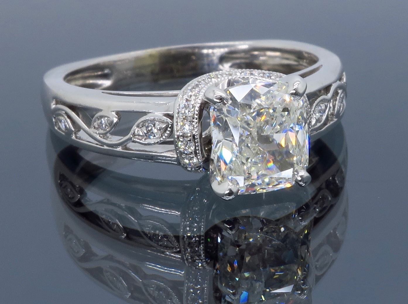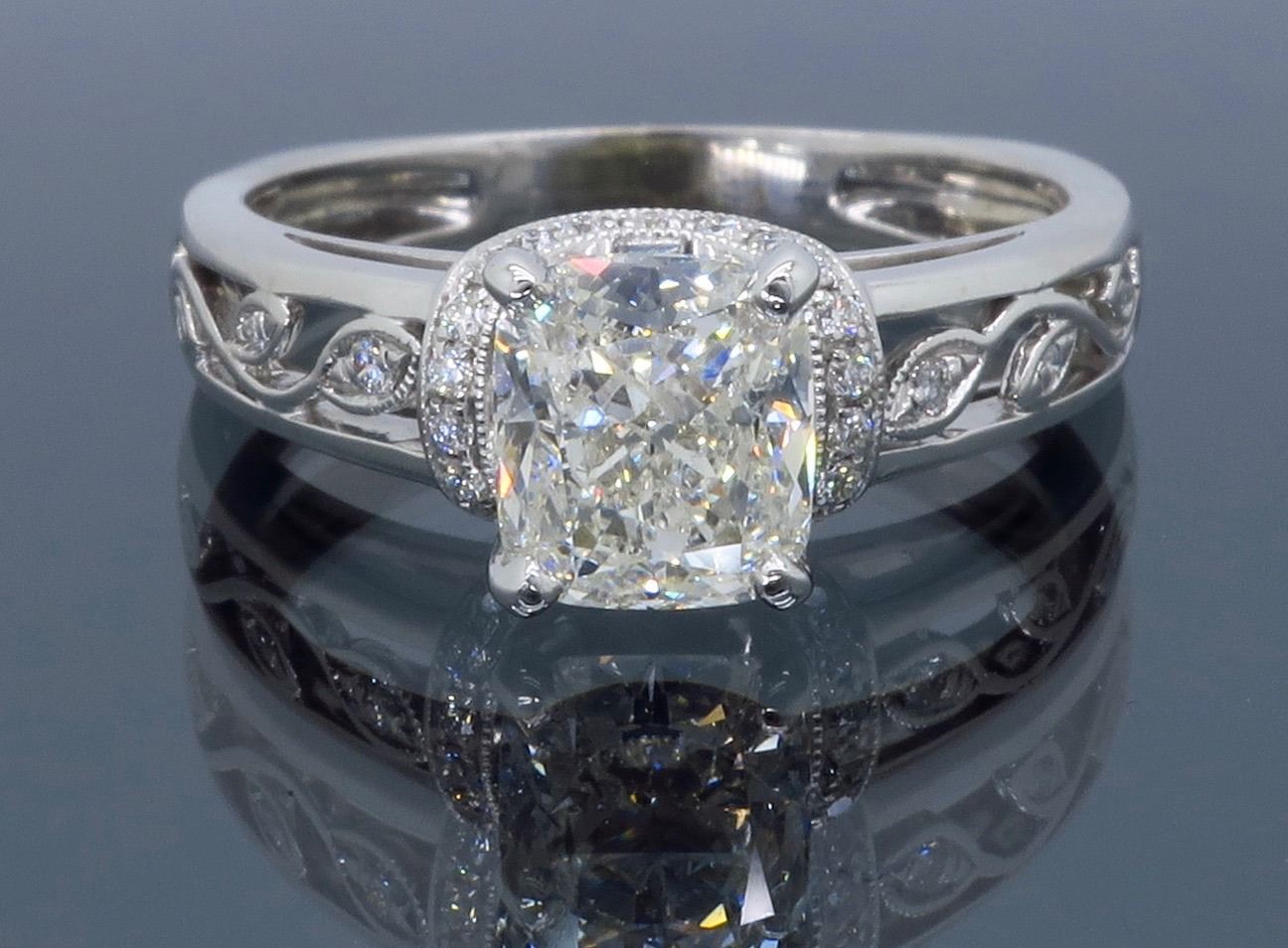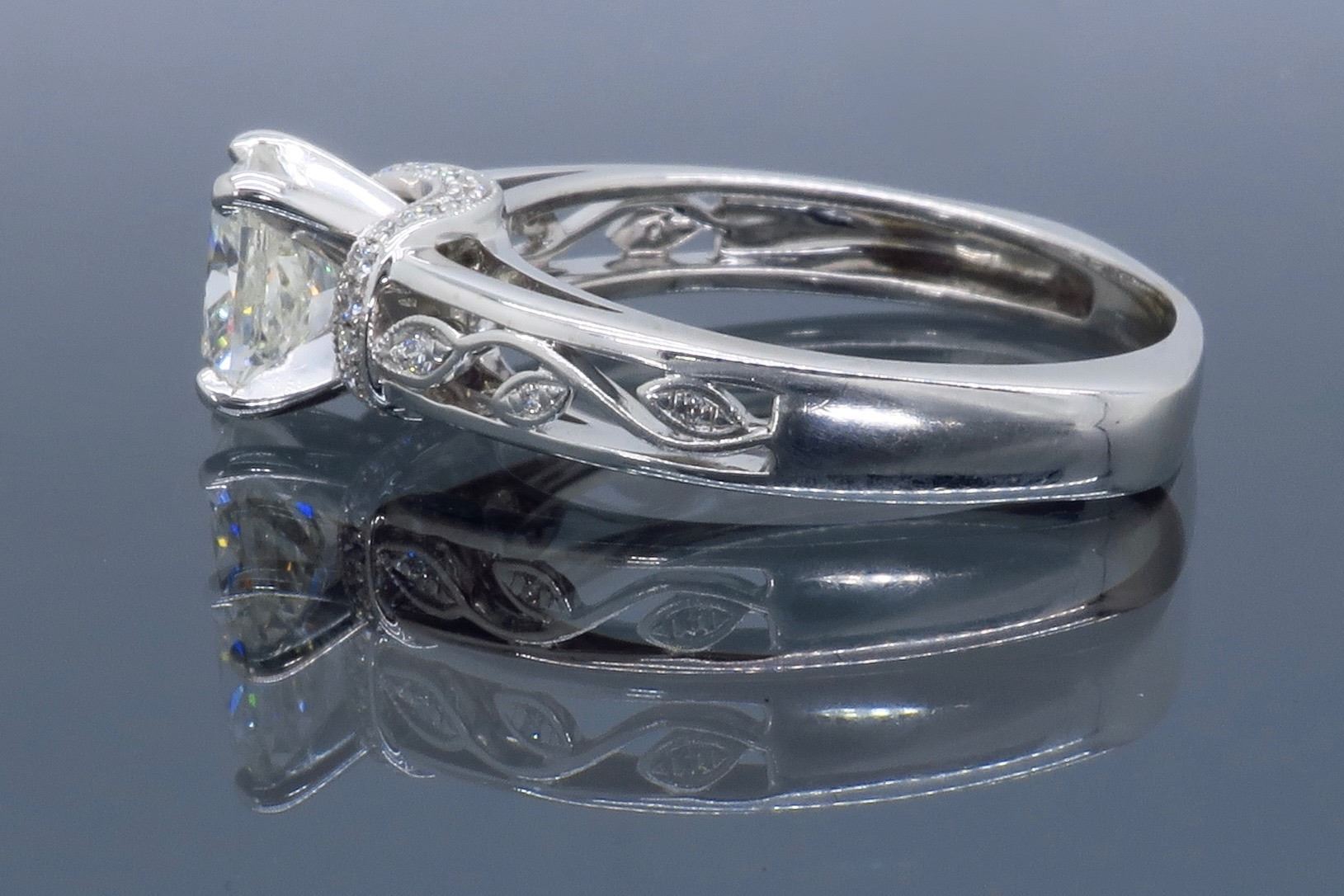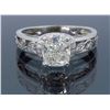 One 18KT White Gold 1.37ctw Diamond Ring. (1) Cushion cut Diamond with a total weight of 1.25cts with a color of H and clarity of SI-2. Round diamonds with a total weight of 0.12cts. Total weight of this ring is 4.7 grams.