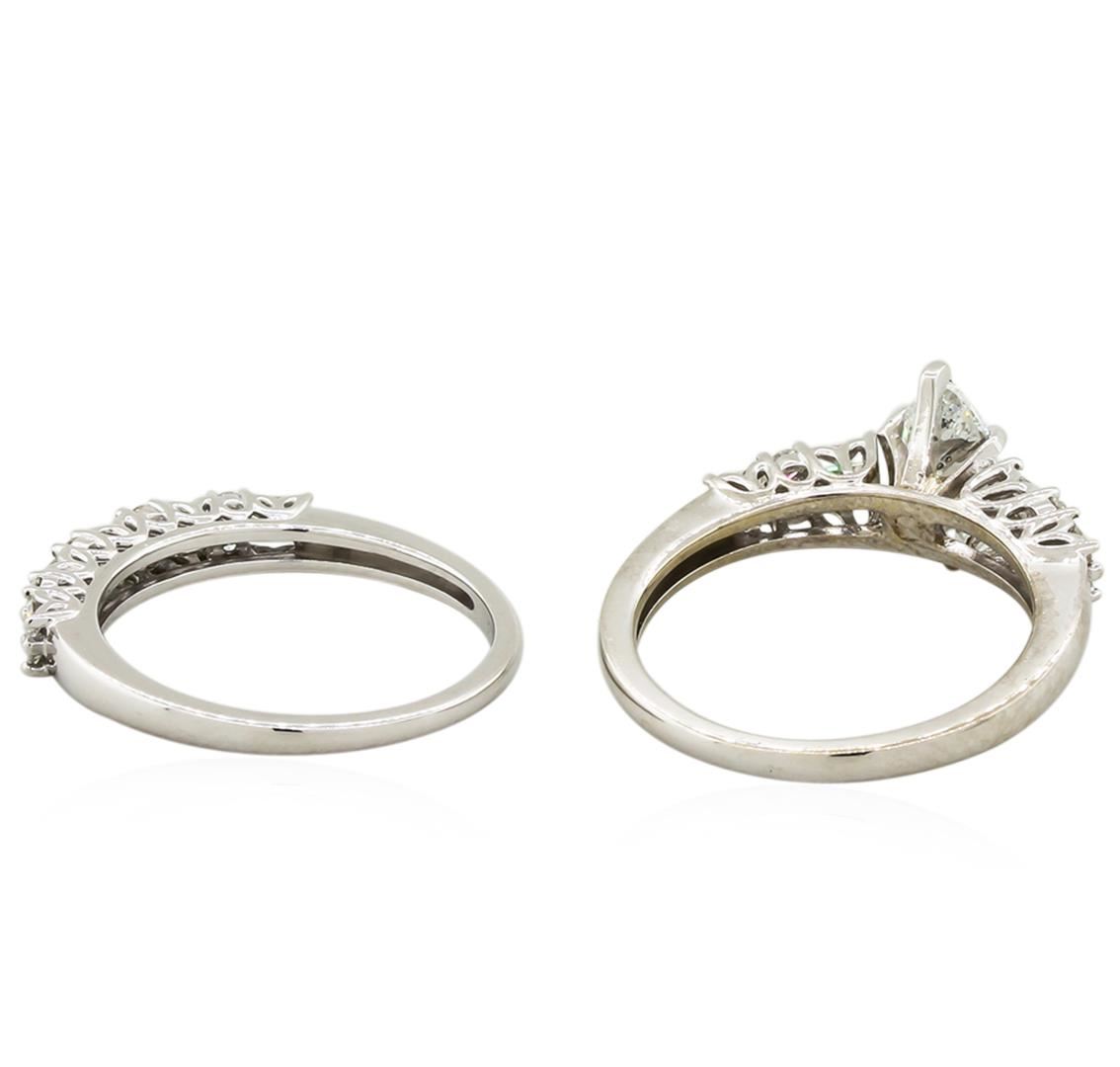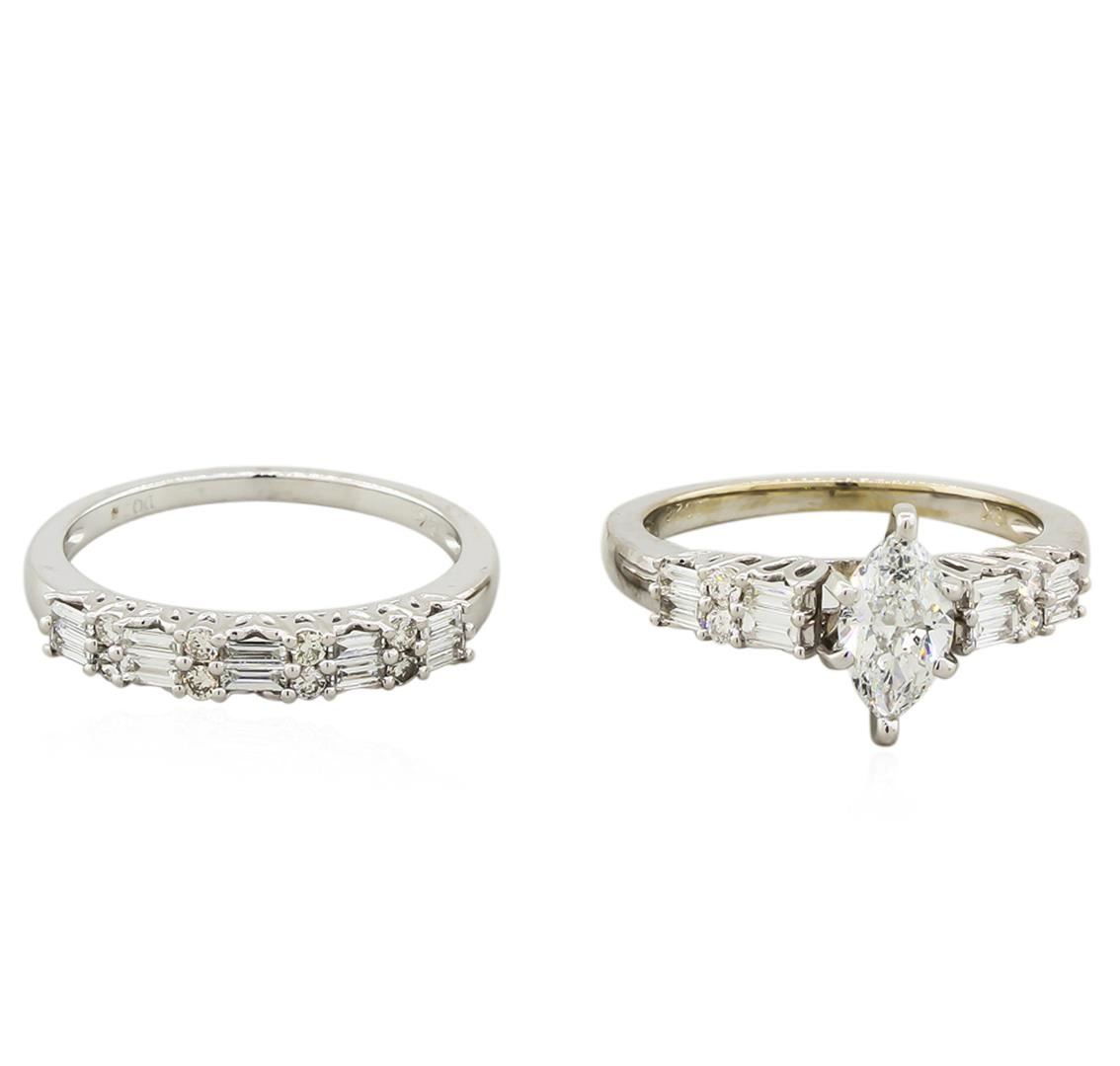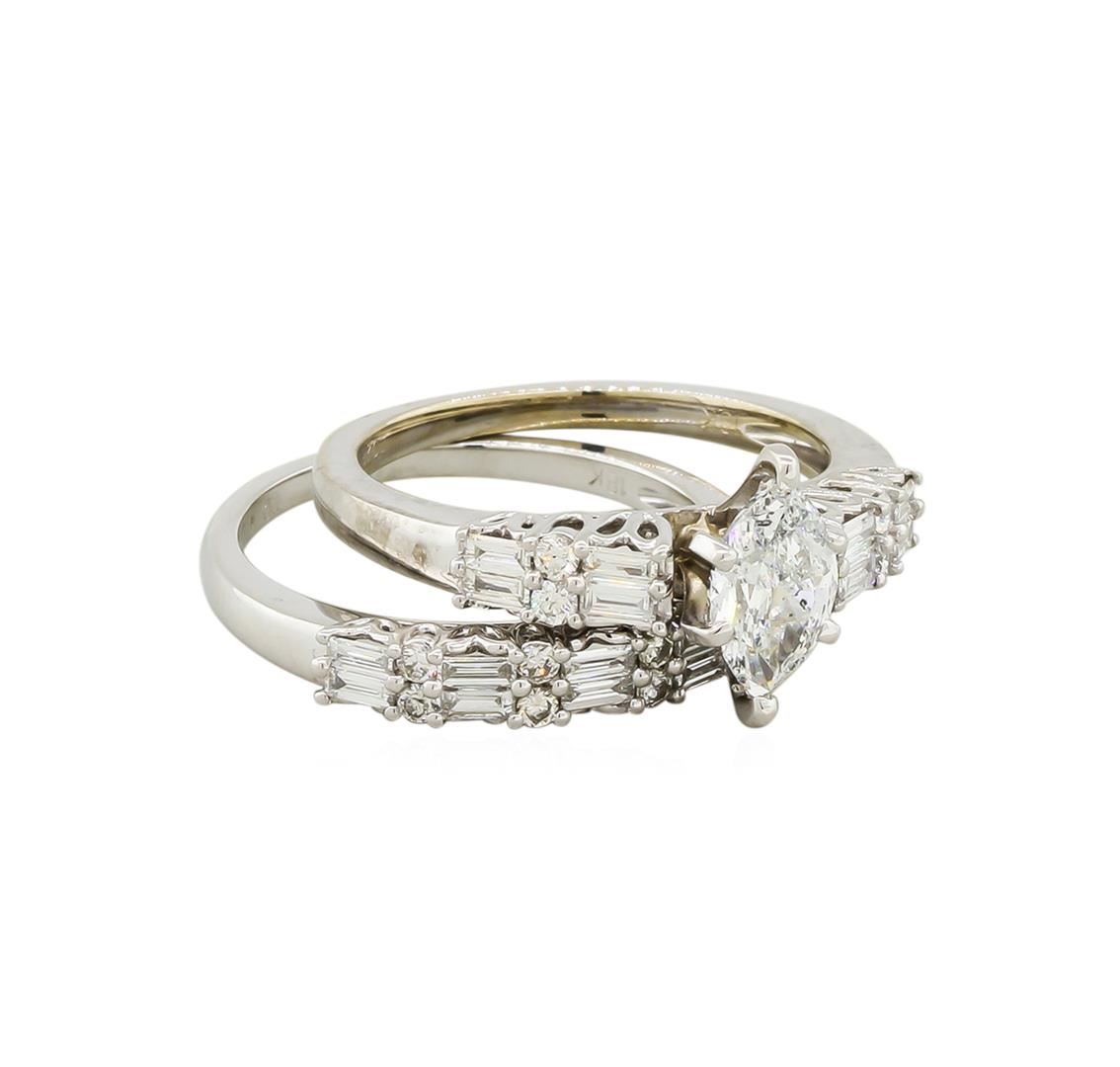 Beautiful diamond engagement ring and wedding band set featuring 6.20 grams 18KT white gold, one marquise cut center-stone weighing 0.77 carats and thirty baguette and round diamonds totaling 0.62 carats.