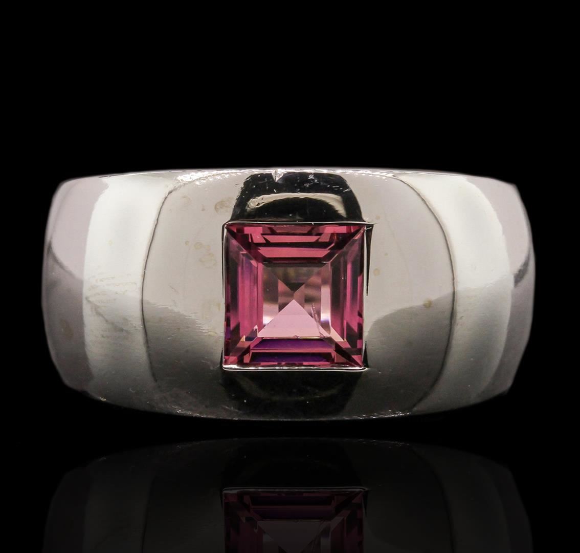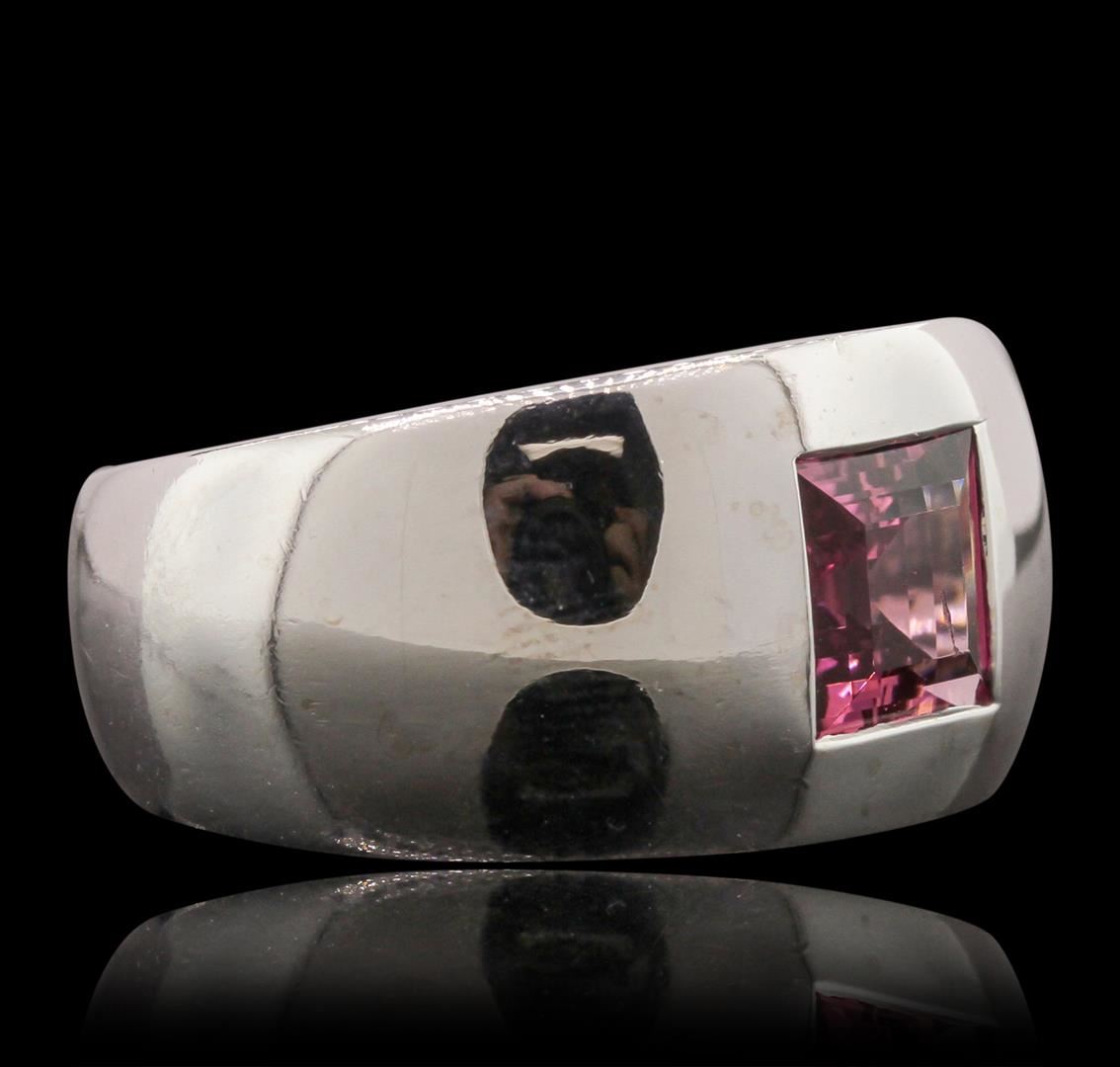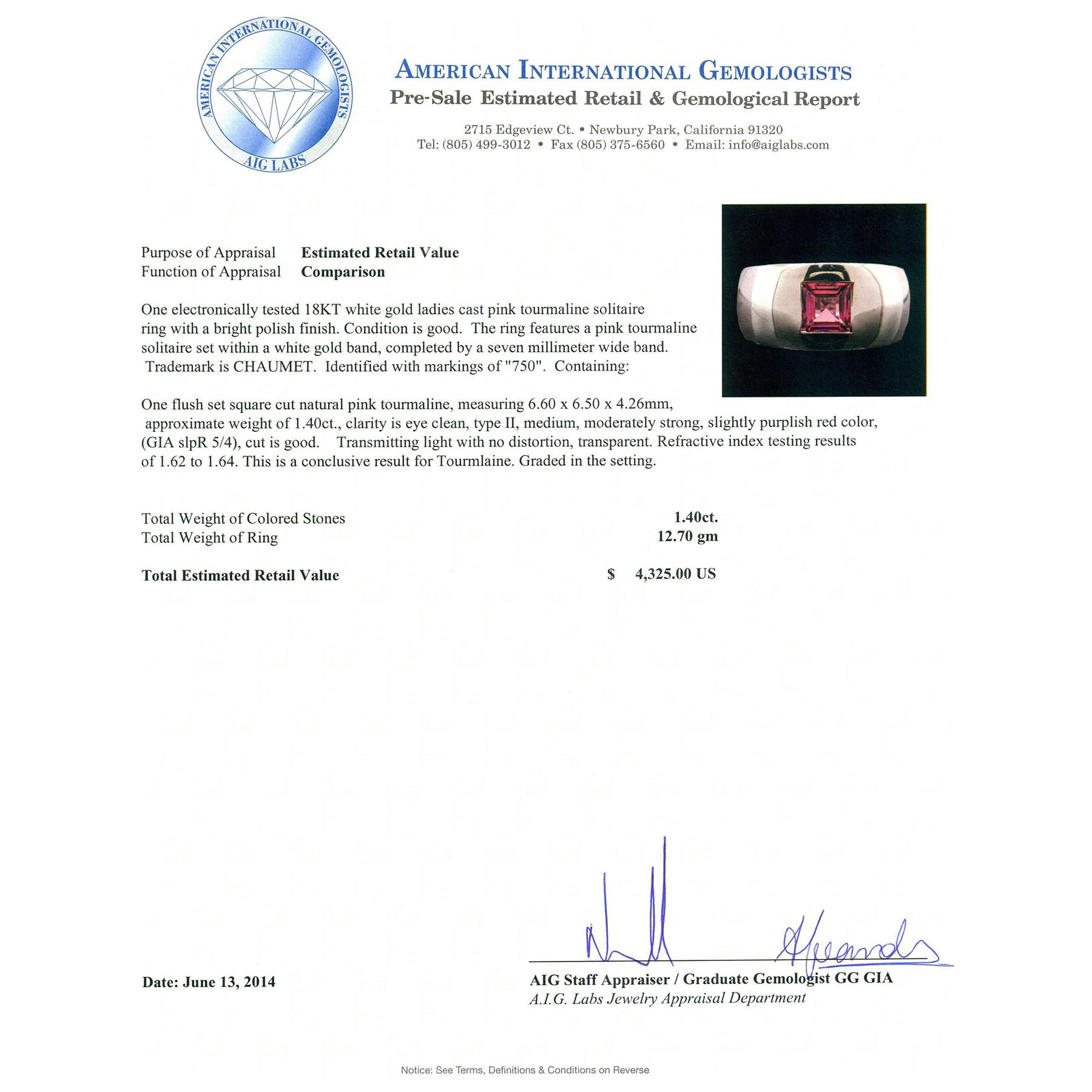 One electronically tested 18KT white gold ladies cast pink tourmaline solitaire ring with a bright polish finish. Condition is good. The ring features a pink tourmaline solitaire set within a white gold band, completed by a seven millimeter wide band. Trademark is CHAUMET. Identified with markings of "750". Containing: One flush set square cut natural pink tourmaline, measuring 6.60 x 6.50 x 4.26mm, approximate weight of 1.40ct., clarity is eye clean, type II, medium, moderately strong, slightly purplish red color, (GIA slpR 5/4), cut is good. Transmitting light with no distortion, transparent. Refractive index testing results of 1.62 to 1.64. This is a conclusive result for Tourmlaine. Graded in the setting. Total Weight of Colored Stones 1.40ct. Total Weight of Ring 12.70 grams. AIG Appraised at $4,325.00.