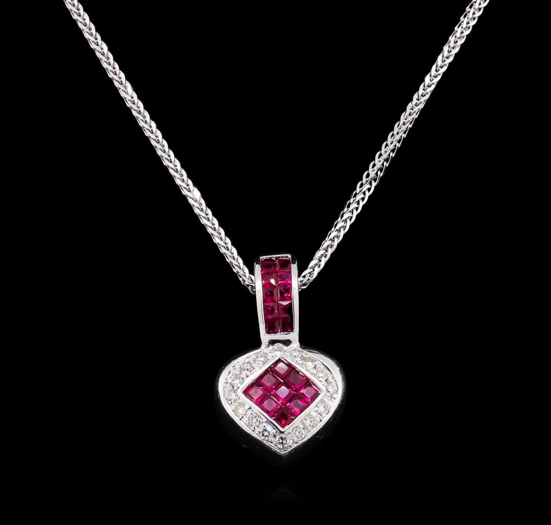One electronically tested 18KT white gold ladies cast & assembled ruby and diamond heart pendant with chain. Condition is good. The pendant features a ruby and diamond set heart, completed by a ruby bail. The pendant is supported by an eighteen inch length 14KT white gold designer style chain, terminating in a lobster claw clasp. Bright polish finish. Identified with markings of "18K". Containing: Twenty-one invisible set princess mixed cut natural rubies, measuring 2.30 x 2.00 x 1.30mm, approximate total weight of 1.40ct., clarity is slightly included, type II, medium dark, moderately strong, slightly purplish red color, (GIA slpR 6/4), cut is good. Transmitting light somewhat diffusely, transparent to translucent. Naturally occurring internal & external characteristics are present. Measurements & the color grade are an average for the group. Graded in the setting. Ruby has a low tolerance to rhodium plating, repolishing the surface, & ultrasonic cleaning. Sixteen bead set round brilliant cut diamonds, measuring 1.90 - 1.80 x 1.11mm (depth est.) approximate total weight of 16 Stones = 0.50ct. Graded in the setting. Clarity VS-1 to VS-2. Color H -- J. Total Weight of Colored Stones 1.40ct. Total Weight of Diamonds 0.50ct. Total Weight of Pendant With Chain 15.24gm. AIG Appraised at $6,465.00.