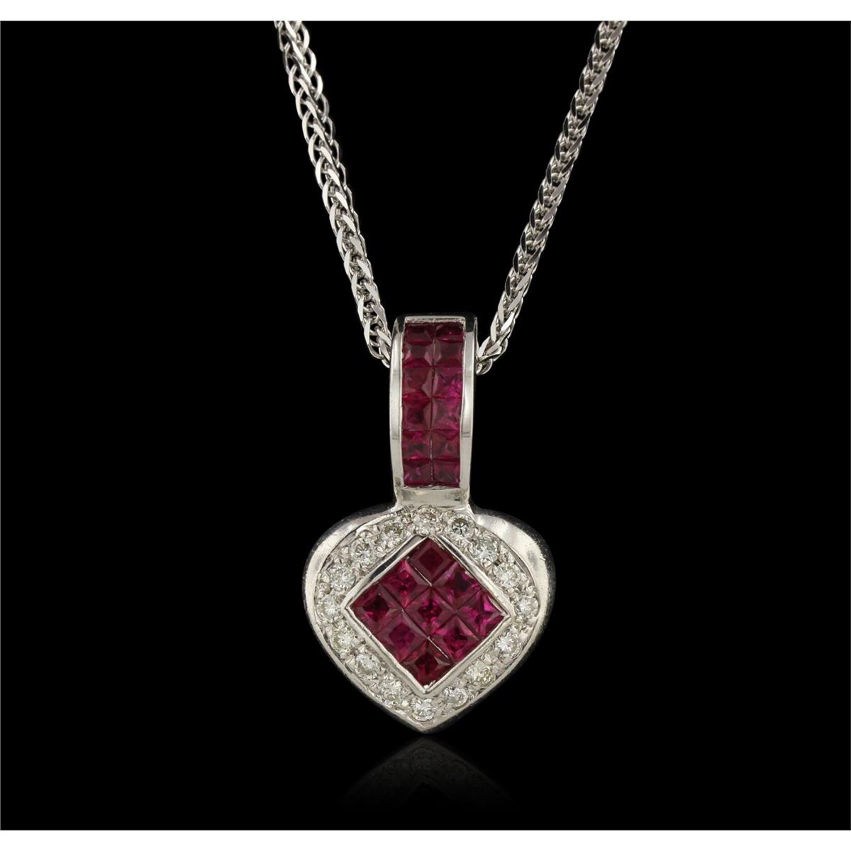 One electronically tested 18KT white gold ladies cast & assembled ruby and diamond heart pendant with chain. Condition is good. The pendant features a ruby and diamond set heart, completed by a ruby bail. The pendant is supported by an eighteen inch length 14KT white gold designer style chain, terminating in a lobster claw clasp. Bright polish finish. Identified with markings of "18K". Containing: Twenty-one invisible set princess mixed cut natural rubies, measuring 2.30 x 2.00 x 1.30mm, approximate total weight of 1.40ct., clarity is slightly included, type II, medium dark, moderately strong, slightly purplish red color, (GIA slpR 6/4), cut is good. Transmitting light somewhat diffusely, transparent to translucent. Naturally occurring internal & external characteristics are present. Measurements & the color grade are an average for the group. Graded in the setting. Ruby has a low tolerance to rhodium plating, repolishing the surface, & ultrasonic cleaning. Sixteen bead set round brilliant cut diamonds, measuring 1.90 - 1.80 x 1.11mm (depth est.) approximate total weight of 16 Stones = 0.50ct. Graded in the setting. Clarity VS-1 to VS-2. Color H -- J. Total Weight of Colored Stones 1.40ct. Total Weight of Diamonds 0.50ct. Total Weight of Pendant With Chain 15.24gm. AIG Appraised at $6,465.00.