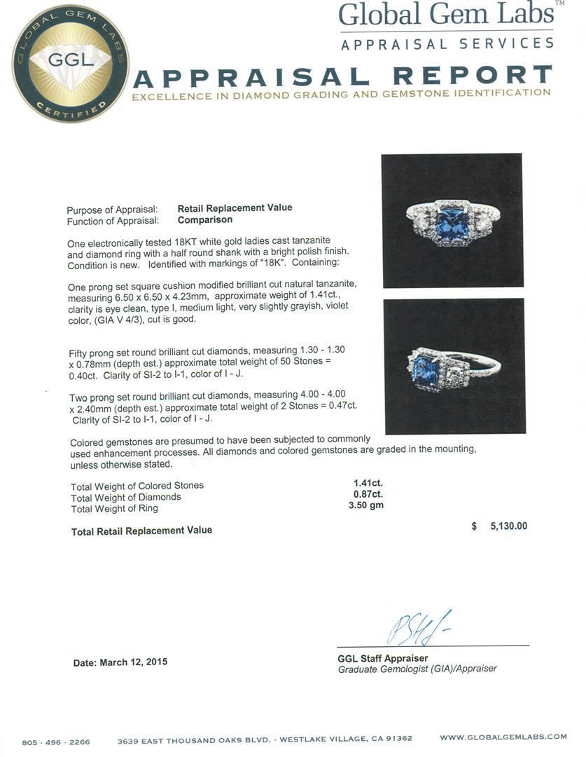One electronically tested 18KT white gold ladies cast tanzanite and diamond ring with a half round shank with a bright polish finish. Identified with markings of "18K". Condition is new. Containing: One prong set square cushion modified brilliant cut natural tanzanite, measuring 6.50 x 6.50 x 4.23mm, approximate weight of 1.41ct., clarity is eye clean, type I, medium light, very slightly grayish, violet color, (GIA V 4/3), cut is good. Fifty prong set round brilliant cut diamonds, measuring 1.30 - 1.30 x 0.78mm (depth est.) approximate total weight of 50 Stones = 0.40 ct. Clarity: SI-2 to I-1. Color: I - J. Two prong set round brilliant cut diamonds, measuring 4.00 - 4.00 x 2.40mm (depth est.) approximate total weight of 2 Stones = 0.47ct. Clarity: SI-2 to I-1. Color: I - J. Colored gemstones are presumed to have been subjected to commonly used enhancement processes. All diamonds and colored gemstones are graded in the mounting, unless otherwise stated. Total Weight of Colored Stones 1.41ct. Total Weight of Diamonds 0.87ct. Total Weight of Ring 3.50 grams. GGL Appraised.