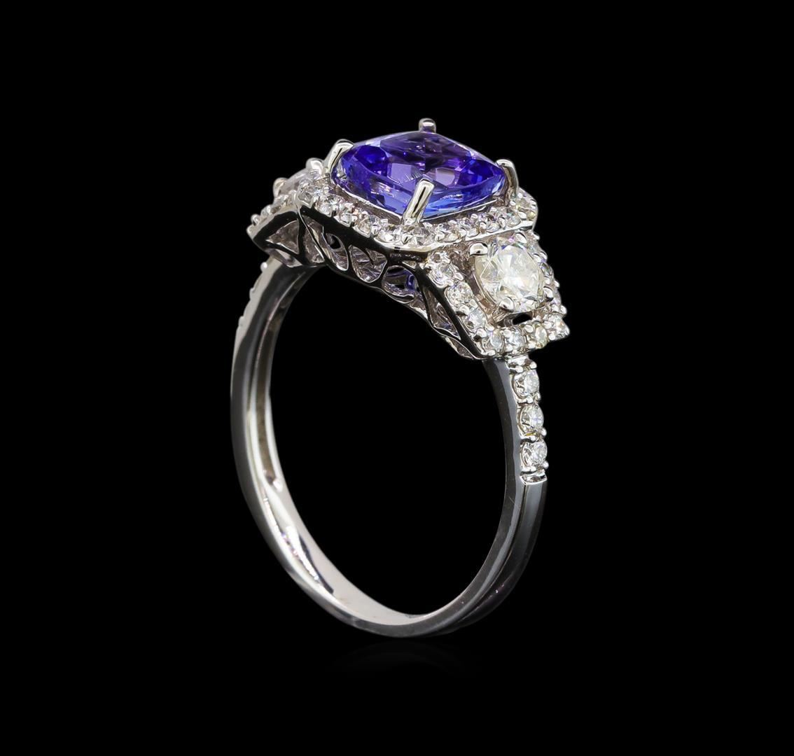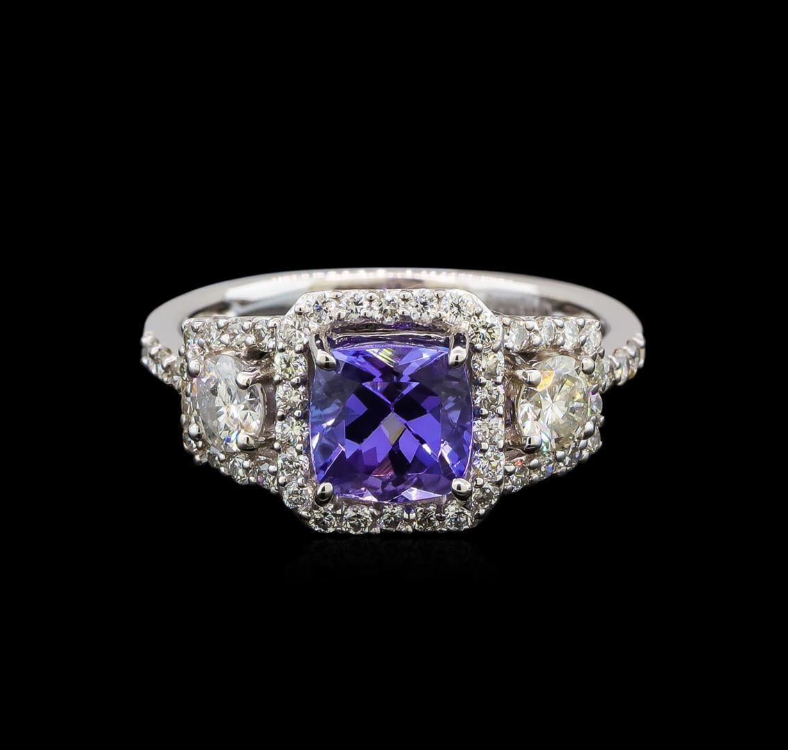 One electronically tested 18KT white gold ladies cast tanzanite and diamond ring with a half round shank with a bright polish finish. Identified with markings of "18K". Condition is new. Containing: One prong set square cushion modified brilliant cut natural tanzanite, measuring 6.50 x 6.50 x 4.23mm, approximate weight of 1.41ct., clarity is eye clean, type I, medium light, very slightly grayish, violet color, (GIA V 4/3), cut is good. Fifty prong set round brilliant cut diamonds, measuring 1.30 - 1.30 x 0.78mm (depth est.) approximate total weight of 50 Stones = 0.40 ct. Clarity: SI-2 to I-1. Color: I - J. Two prong set round brilliant cut diamonds, measuring 4.00 - 4.00 x 2.40mm (depth est.) approximate total weight of 2 Stones = 0.47ct. Clarity: SI-2 to I-1. Color: I - J. Colored gemstones are presumed to have been subjected to commonly used enhancement processes. All diamonds and colored gemstones are graded in the mounting, unless otherwise stated. Total Weight of Colored Stones 1.41ct. Total Weight of Diamonds 0.87ct. Total Weight of Ring 3.50 grams. GGL Appraised.