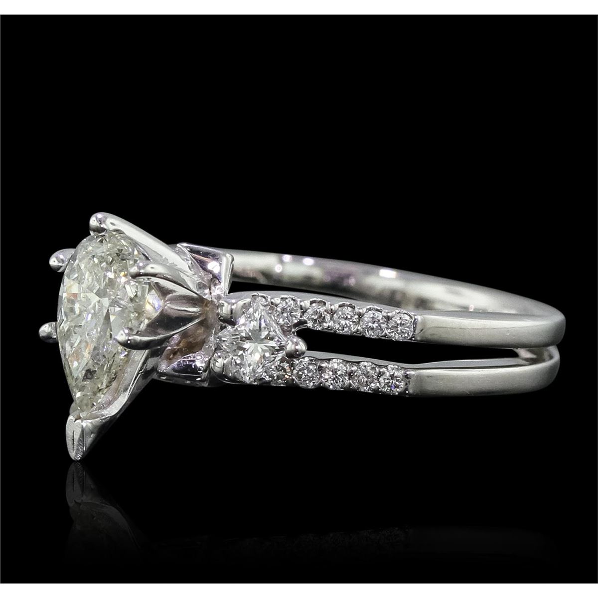 One electronically tested 18KT white gold Ladies combination cast & assembled engagement ring with a bright polish finish. Condition is new. Identified with markings of "18K". Containing: One prong set pear shaped cut diamond, measuring 9.00 x 5.50 x 3.47mm (depth est.) approximate weight of 1.01ct. Clarity: I-1. Color: K, Cut is Good. Two prong set princess cut diamonds, measuring 2.50 x 2.50 x 1.88mm (depth est.) approximate. Total Weight of 2 Stones = 0.19ct. Clarity: SI-1. Color: H, Cut is Good. Twenty-Six prong set round brilliant cut diamonds, measuring 1.30 - 1.30 x 0.78mm (depth est.) approximate. Total Weight of 26 Stones = 0.21ct. Clarity: I-1. Color: I - J, Cut is Good. Total Weight of Diamonds 1.41ct. Total Weight of Engagement Ring 6.10 grams. GGL Appraised at $10,475.00.