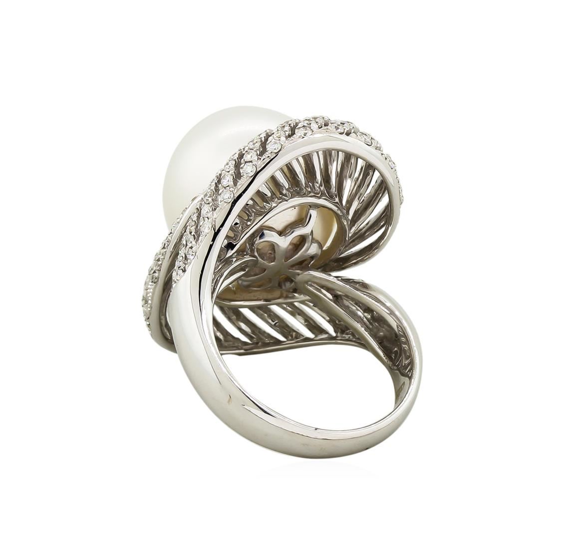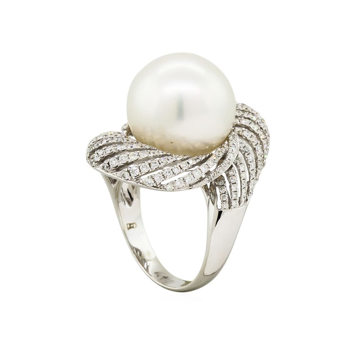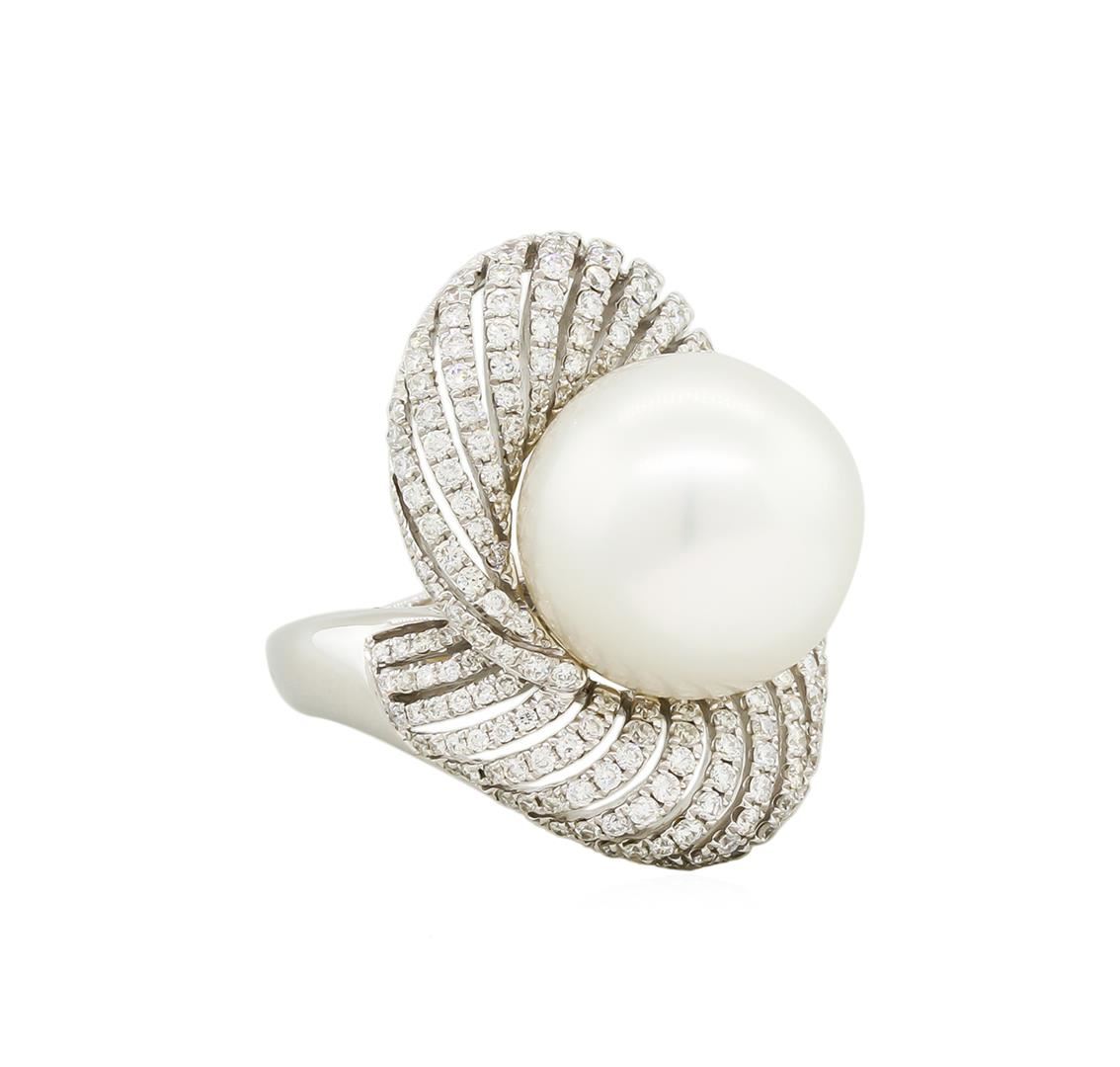 Two hundred and fourteen round diamonds weighing 1.41 carats beautifully frame the impressive 15.00mm pearl center stone of this gorgeous pearl and diamond ring. Total weight 9.70 grams.