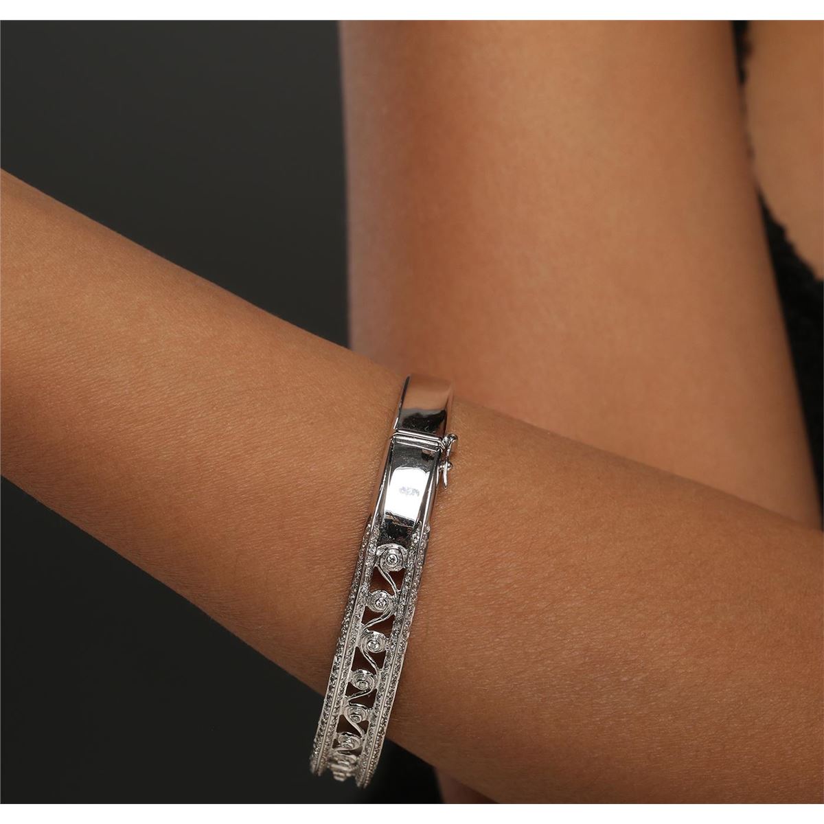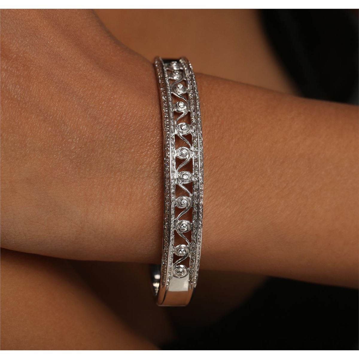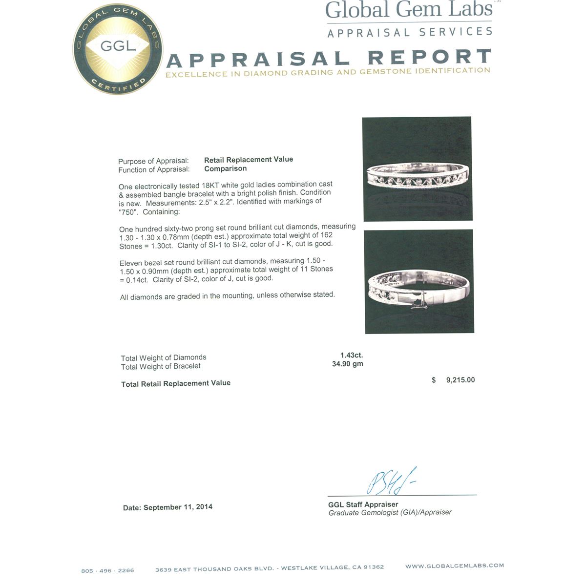 One electronically tested 18KT white gold ladies combination cast & assembled bangle bracelet with a bright polish finish. Measurements: 2.5" x 2.2". Identified with markings of "750". Condition is new. Containing: One Hundred Sixty-Two prong set round brilliant cut diamonds, measuring 1.30 - 1.30 x 0.78mm (depth est.) approximate total weight of 162 Stones = 1.30ct. Clarity: SI-1 to SI-2. Color: J - K, Cut is Good. Eleven bezel set round brilliant cut diamonds, measuring 1.50 - 1.50 x 0.90mm (depth est.) approximate total weight of 11 Stones = 0.14ct. Clarity: SI-2. Color: J, Cut is Good. All diamonds are graded in the mounting, unless otherwise stated. Total Weight of Diamonds 1.43ct. Total Weight of Bracelet 34.90 grams. GGL Appraised at $9,215.00.