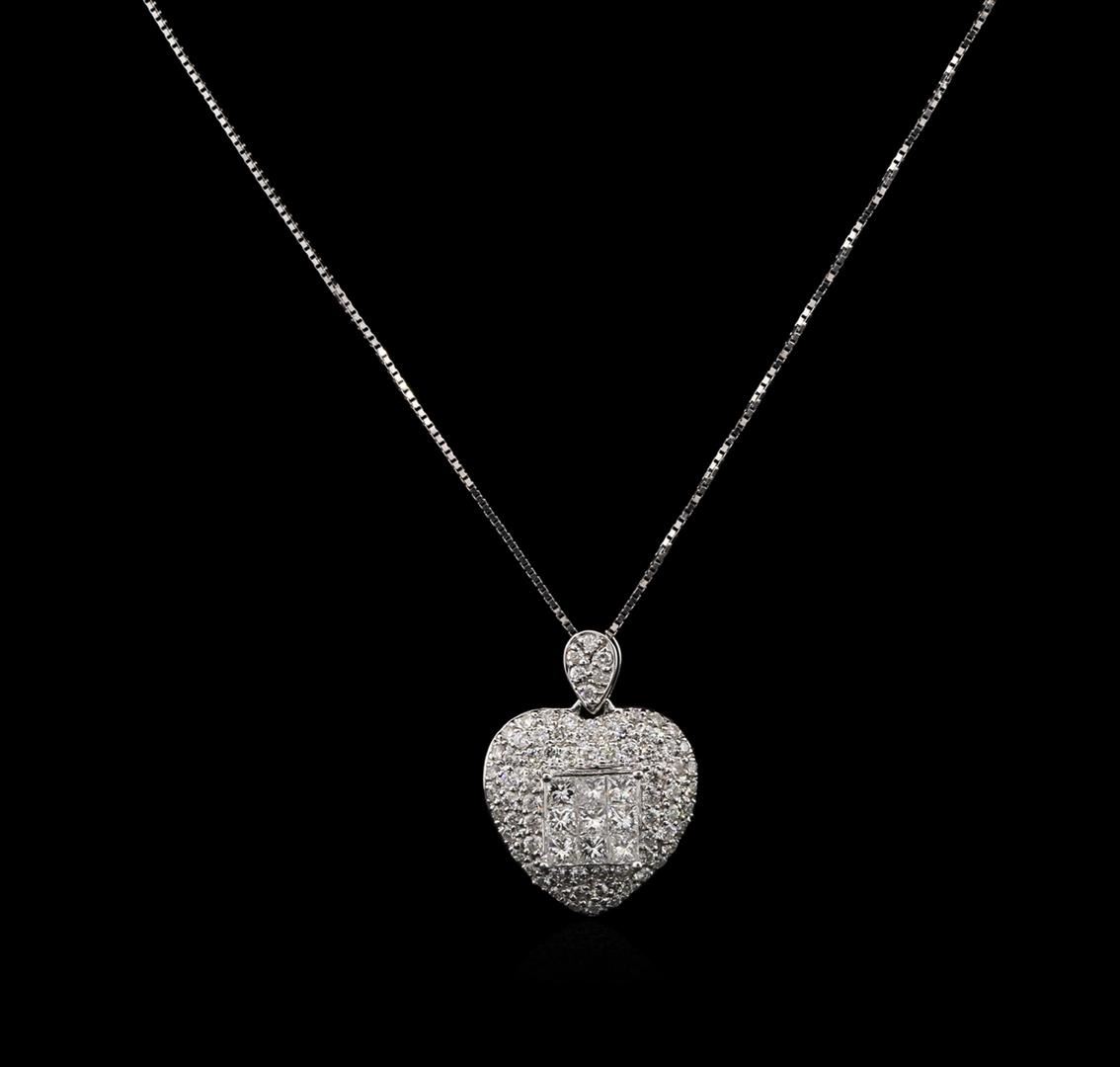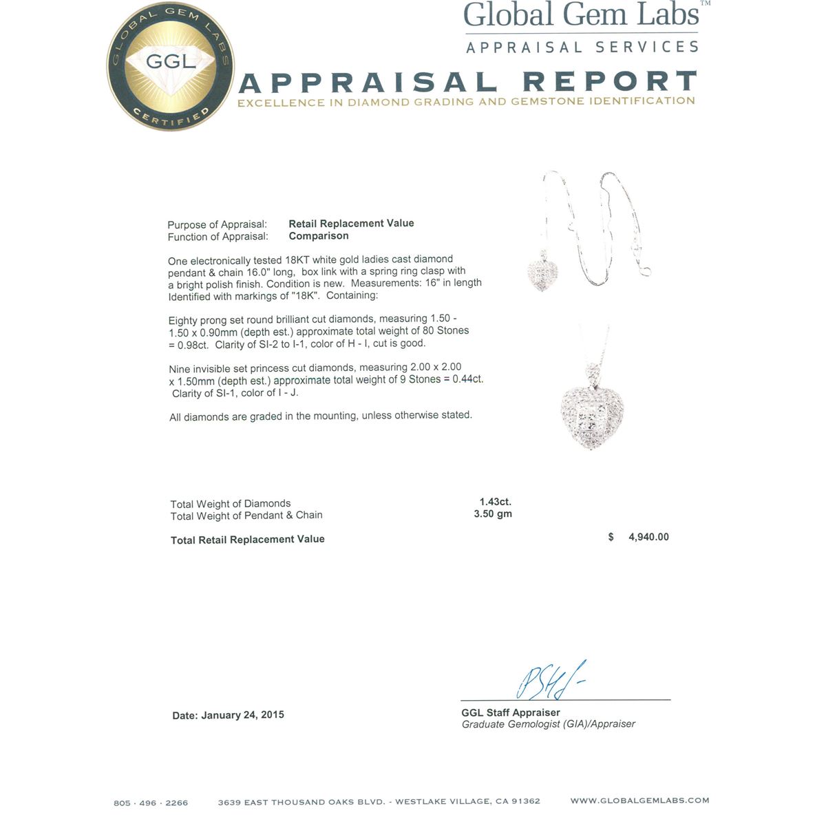 One electronically tested 18KT white gold ladies cast diamond pendant & chain 16.0" long, box link with a spring ring clasp with a bright polish finish. Measurements: 16" in length Identified with markings of "18K". Condition is new. Containing: Eighty prong set round brilliant cut diamonds, measuring 1.50 - 1.50 x 0.90mm (depth est.) approximate total weight of 80 Stones = 0.98ct. Clarity: SI-2 to I-1. Color: H - I, Cut is Good. Nine invisible set princess cut diamonds, measuring 2.00. x 2.00. x 1.50mm (depth est.) approximate total weight of 9 Stones = 0.44ct. Clarity: SI-1. Color: I - J. All diamonds are graded in the mounting, unless otherwise stated. Total Weight of Diamonds 1.43ct. Total Weight of Pendant & Chain 3.50 grams. GGL Appraised at $4,940.00.