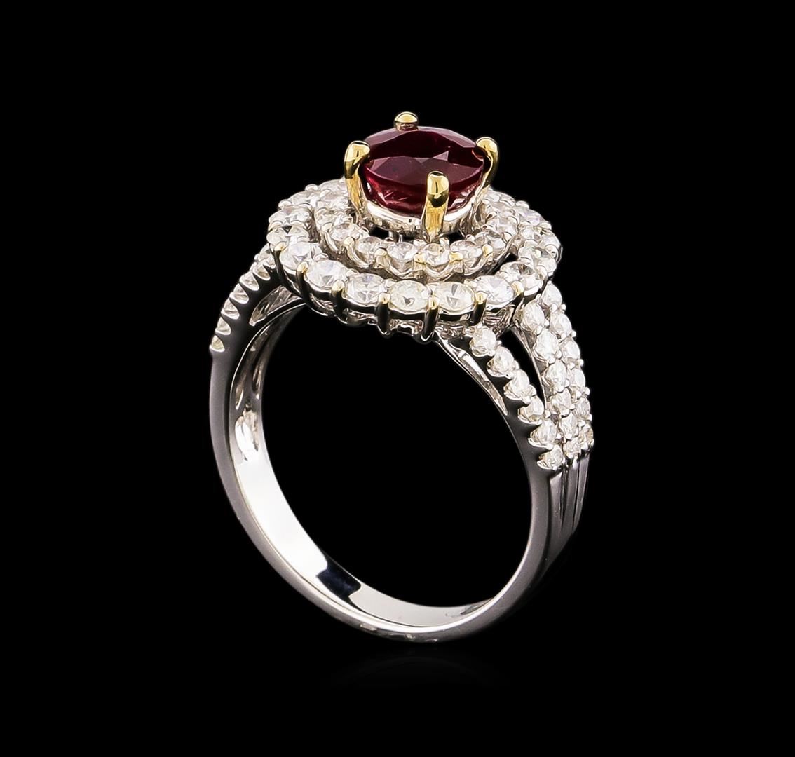 One electronically tested 18KT white gold Ladies combination cast & assembled fashion ring with a bright polish finish. Condition is new. Identified with markings of "750". Containing: Thirty-Six prong set round brilliant cut diamonds, measuring 1.30 - 1.30 x 0.78mm (depth est.) approximate. Total Weight of 36 Stones = 0.36ct. Clarity: I-1. Color: G, Cut is Good. Sixteen prong set round brilliant cut diamonds, measuring 1.50 - 1.50 x 0.90mm (depth est.) approximate. Total Weight of 16 Stones = 0.20ct. Clarity: I-1. Color: G - H, Cut is Good. Eighteen prong set round brilliant cut diamonds, measuring 2.10 - 2.10 x 1.26mm (depth est.) approximate. Total Weight of 18 Stones = 0.91ct. Clarity: SI-2 to I-1. Color: G, Cut is Good. One prong set round modified brilliant cut natural ruby, measuring 6.20 - 6.20 x 4.14 mm, approximate weight of 1.43ct., clarity is heavily included, medium dark, moderately strong, strongly purplish red color, (GIA stpR 6/4), cut is good. Colored gemstones are presumed to have been subjected to commonly used color/clarity enhancement processes. Total Weight of Colored Stones 1.43ct. Total Weight of Diamonds 1.47ct. Total Weight of Ring 5.50 grams. GGL Appraised at $4,470.00.
