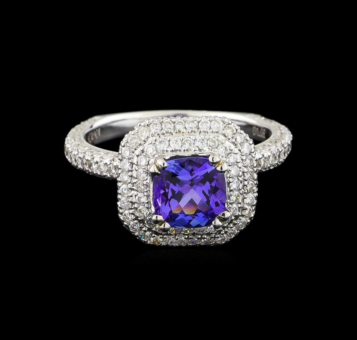 One electronically tested 18KT white gold ladies cast tanzanite and diamond ring. The featured tanzanite is set within a tiered diamond bezel supported by diamond set shoulders, completed by a two millimeter wide band. Bright polish finish with milgrain detailing. Trademark is HANA. Identified with markings of "18K". Condition is new, good workmanship. Containing: One prong set square cushion brilliant cut natural tanzanite, measuring 6.45 x 6.40 x 4.10mm, 8% bulge factor, approximate weight of 1.44ct., clarity is eye clean, type I, medium dark, very slightly grayish, bluish violet color, (GIA bV 6/3), cut is good. Transmitting light with no distortion, transparent. Graded in the setting. Tanzanite is a very rare gemstone that is only found in the country of Tanzania. Originally discovered in 1967. Tiffany & Company, named the stone Tanzanite. It is found in the Usumburu Mountains that border the Umba Valley of northern Tanzania. Tanzanite occurs in gray, brown, violet, blue, reddish-purple, & green. The gem is interesting because of its exceptional pleochroism. Rotated in different directions a tanzanite will exhibit multiple changes of color. Tanzanite has a low tolerance to ultrasonic cleaning, and should not be cleaned using this method. One Hundred Ninety-Four prong set round brilliant cut diamonds, measuring 1.20 - 1.10 x 0.69mm (depth est.) approximate total weight of 194 Stones = 1.08ct. Graded in the setting. Clarity: SI-2 to I-2. Color: H - J. Total Weight of Colored Stones 1.44ct. Total Weight of Diamonds 1.08ct. Total Weight of Ring 4.98 grams. AIG Appraised at $7,705.00.